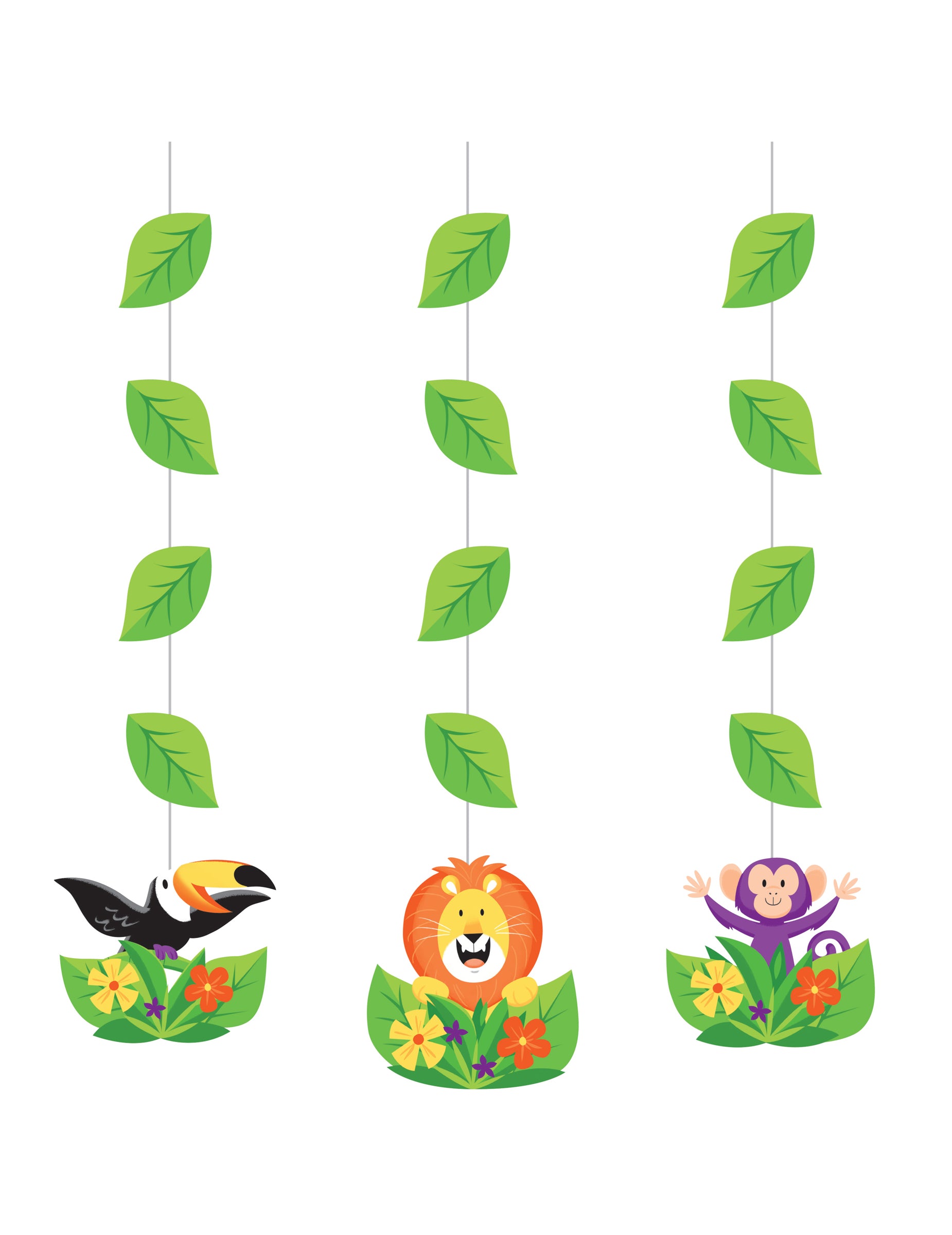 Dodajte divlji dodir svojoj zabavi s ovim setom od 3 komada suspenzije teme. Svaki element sadrži lava, tukana ili majmuna smještenog usred tropskog lišća i živopisnog cvijeća. Visine gotovo 57 cm, Ovi ukrasi su spremni za vješanje zahvaljujući integriranim žicama. Idealan su dodatak za stvaranje atmosfere džungla imerzivno tijekomrođendan vašeg djeteta na Tema džungle safarija.