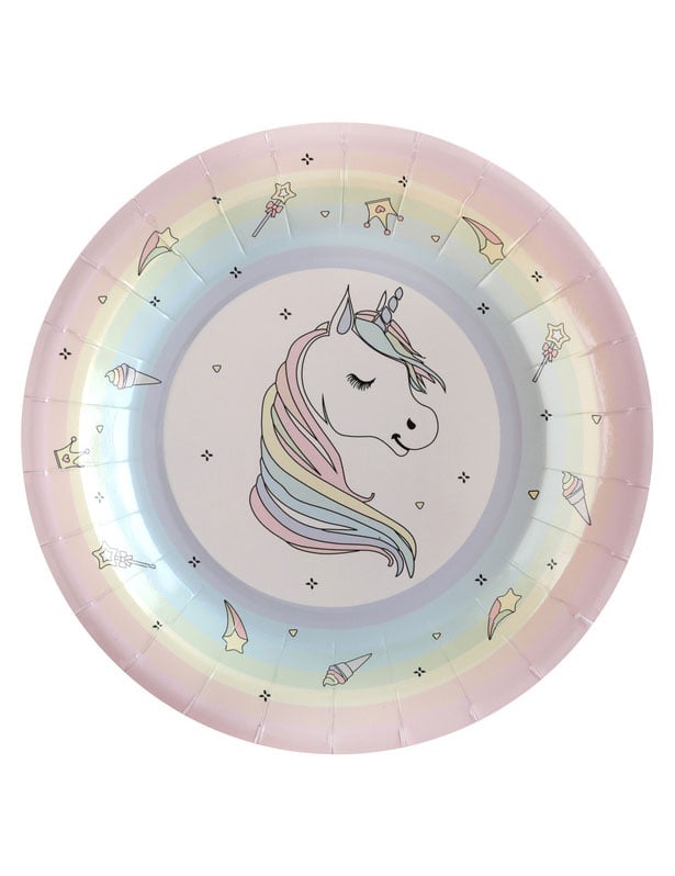 Ovih 10 ploča izrađene su od kartona i mjere otprilike 22,5 cm. Imaju gradijent nekoliko boja u pastelnim tonovima. Ispisani su s različitim uzorcima zvijezda, sladoleda i nakita. U sredini ploče izvuče se veličanstveni jednorog s raznobojnom grivom. Odlučite se za nježni ukras za svoj stol povodom obljetnice na temi Unicorn!