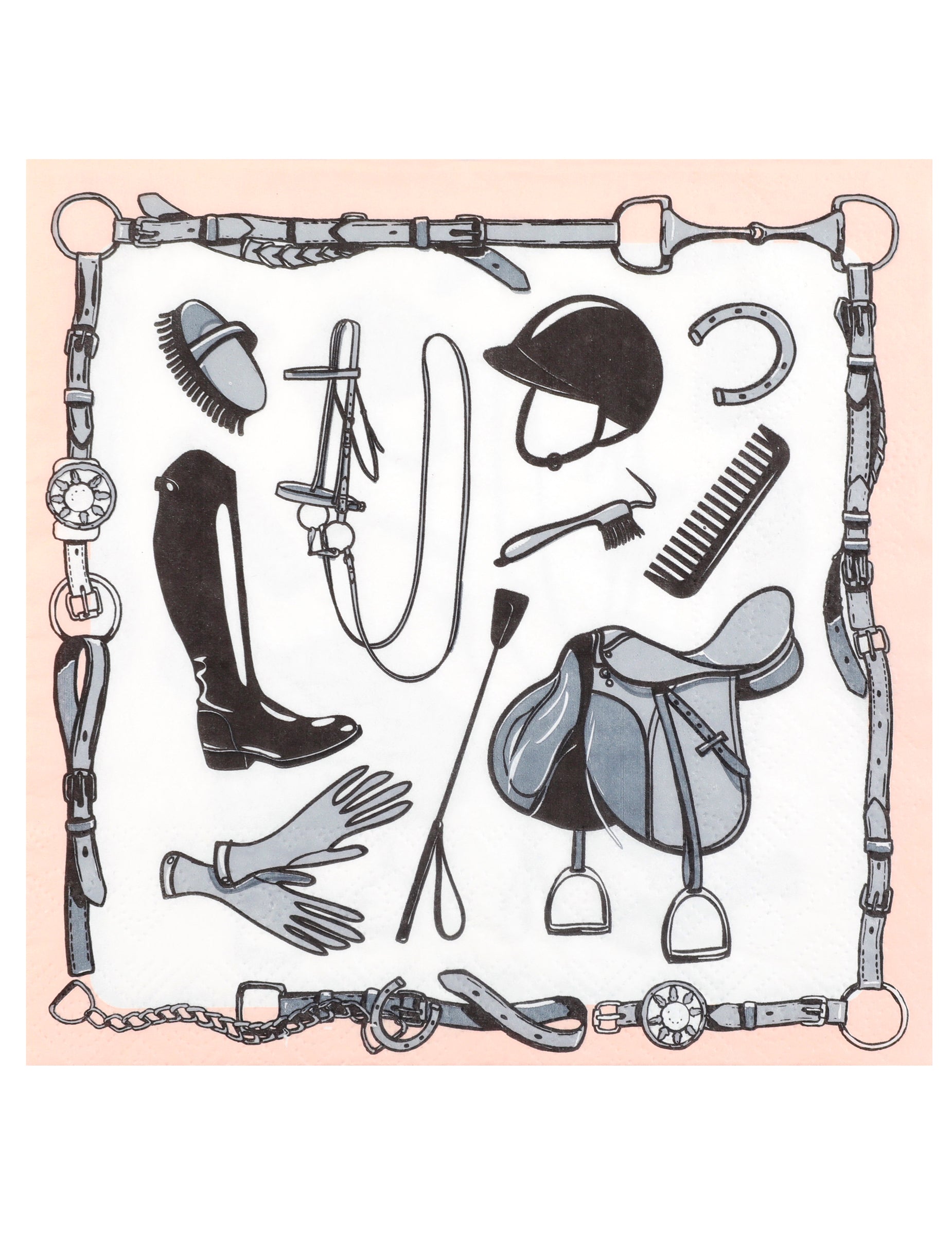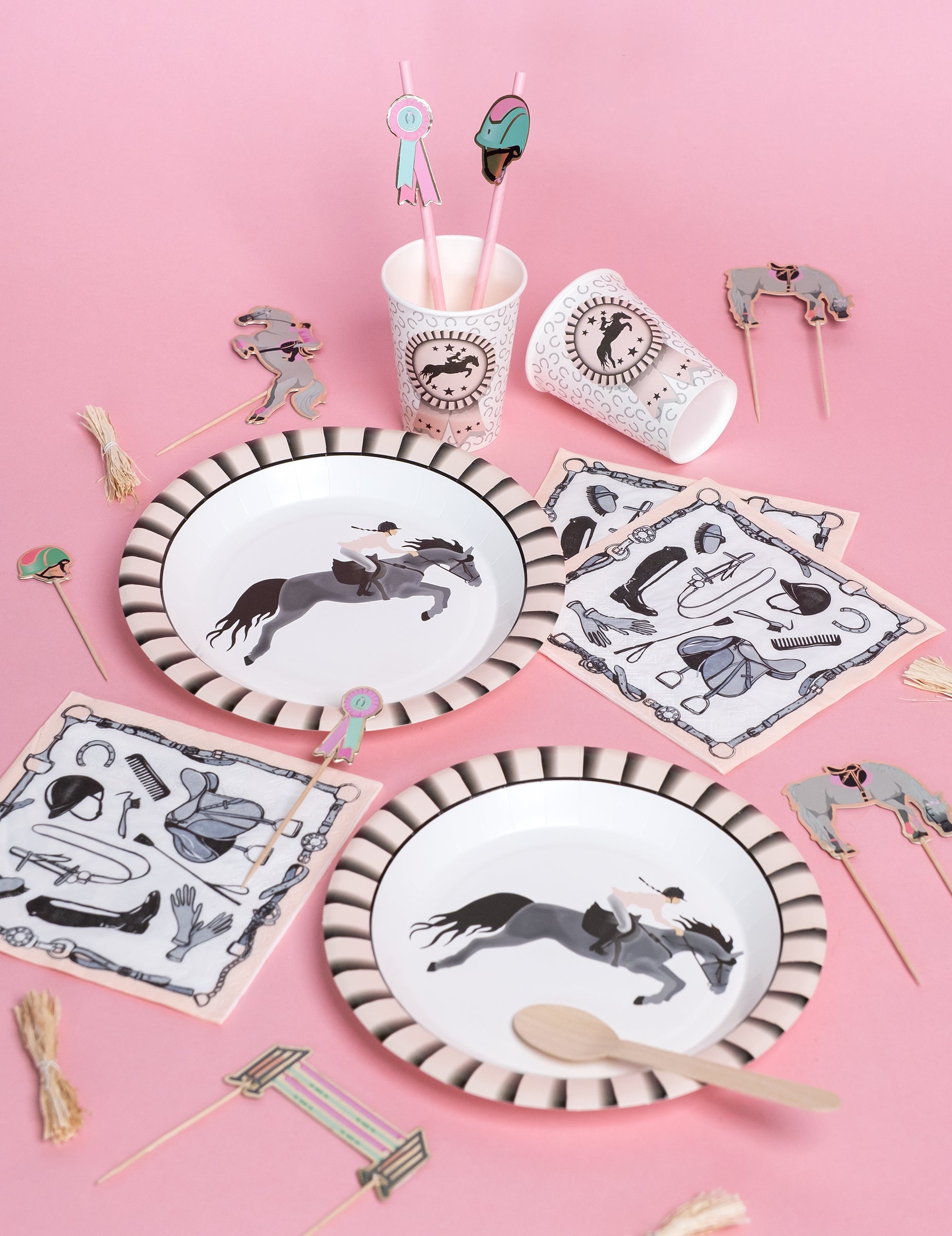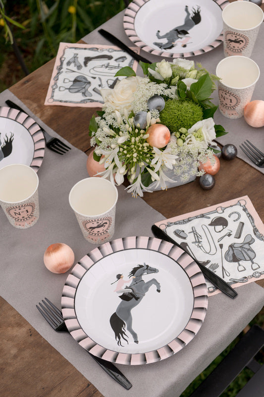 Sublimez votre décoration de table avec ce lot de 20 serviettes jetables au format 33 x 33 cm. Proposées dans des nuances de gris et rose poudré, elles affichent de nombreux motifs liés au thème de l'équitation : selle, bottes, bombe et licol. C'est l'accessoire indispensable pour tout petit fan de cheval. Elles s'accorderont à merveille avec le reste de votre vaisselle de fête pour célébrer un anniversaire sur l'univers de l'équitation.