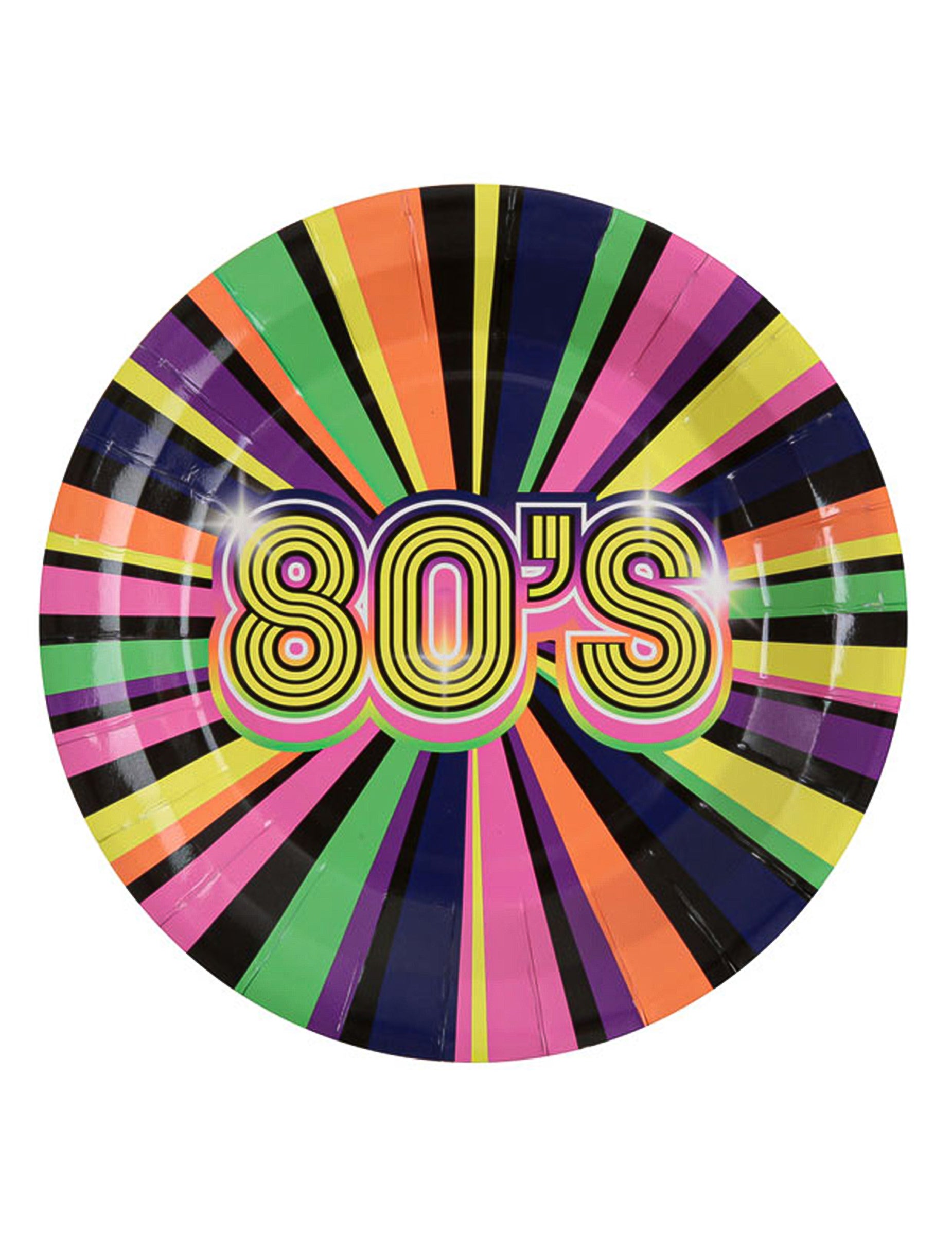 Ovih 10 kartonskih ploča mjeri otprilike 22,5 cm. Oni su okrugli oblik i različite boje. Oni nose natpis žute boje "80 -ih" retro slovima. Ove su ploče idealne za vaš stol na temu 80 -ih godina povodom rođendana ili tematske večeri.