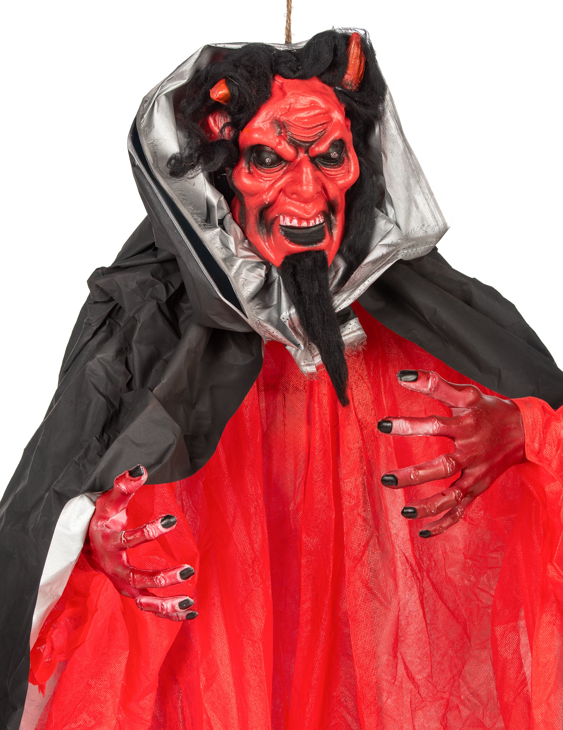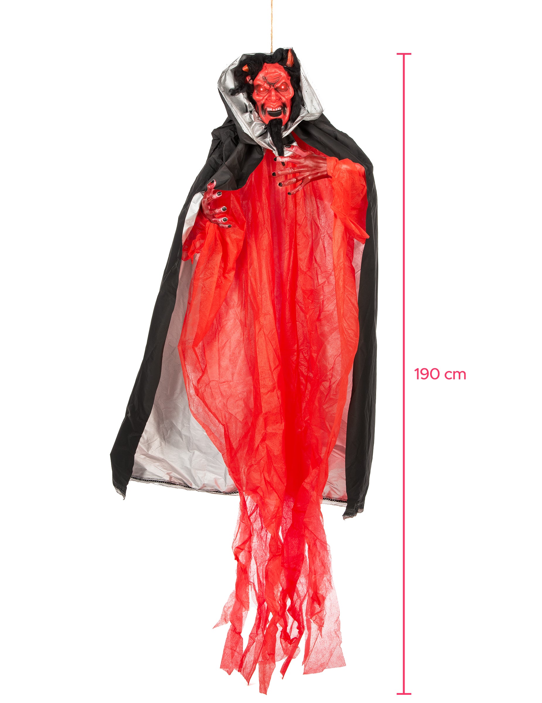 Ovaj animirani i svijetli ukras predstavlja demon. Sve je odjevena u crvenu boju i ima demonsku glavu s rogovima i crnim Barbichetteom. Ovaj ukras mjeri oko 190 cm duljine. Oči su svijetle i postat će crvene rasvjetom. Radi s 3 LR44 baterije. Bit će savršeno za ukrašavanje vaše kuće na Noć vještica.