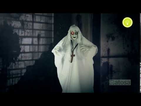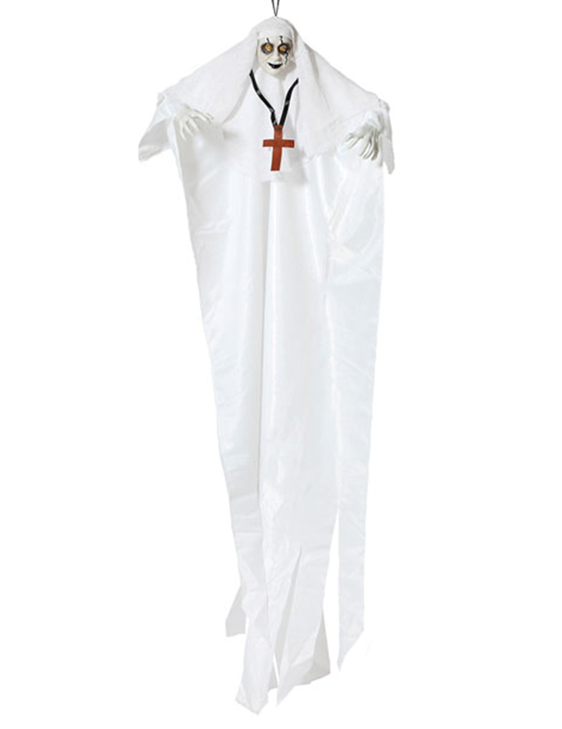 Ovaj viseći ukras predstavlja zombi redovnicu. Potpuno je odjeven u bijelo. Ima vrlo blijedo lice i ruke. Oči su okružene crnom bojom. Ovaj viseći ukras duljina mjeri oko 137 cm. Oči se osvjetljavaju crveno zahvaljujući kutiji za baterije. Dostavlja se s 3 LR44 potrebne baterije. Bit će savršeno za ukrašavanje vašeg doma temom Noć vještica.