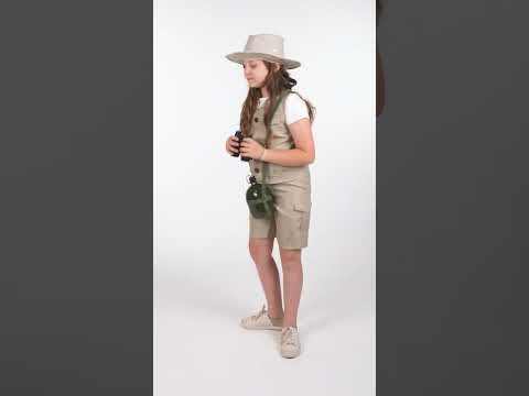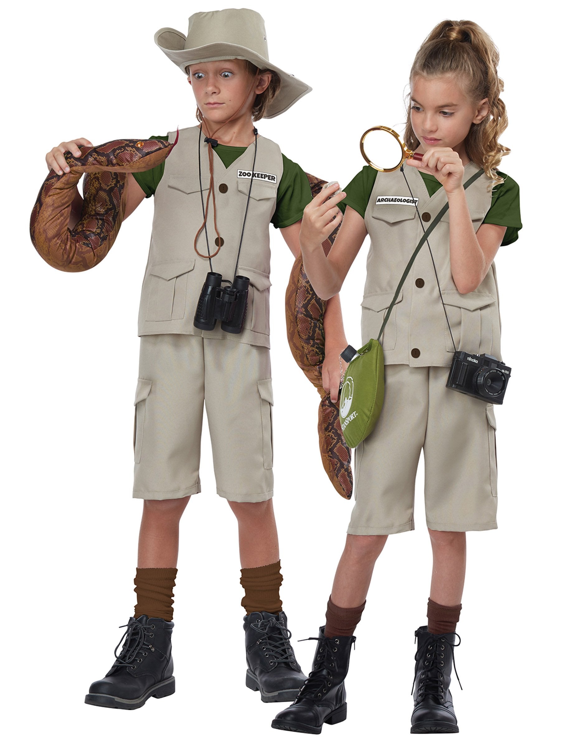 Ovaj avanturistički kostim namijenjen je djeci. Sastoji se od jakne, šešira, naljepnica s imenom trgovine (Park Ranger, arheolog, čuvar zoološkog vrta, stručnjak za divlje životinje) i kratke hlače (leta, blizanci, cipele i čarape nisu uključeni). Jakna je u potpunosti bež s lažnim džepovima i tri gumba, a na jakni je ušivena zelena majica. Kratke hlače nastavljaju istu boju kao i jakna kao i bočni džepovi. Šešir poprima oblik šešira avanturista ili kauboja, sa savijenim rubom. Binokular dovršava izgled avanturista dok naljepnice dolaze malo realizma u odjeću. Pretvorite svoje dijete u pravog avanturista za večer prikrivenu na temu džungle.