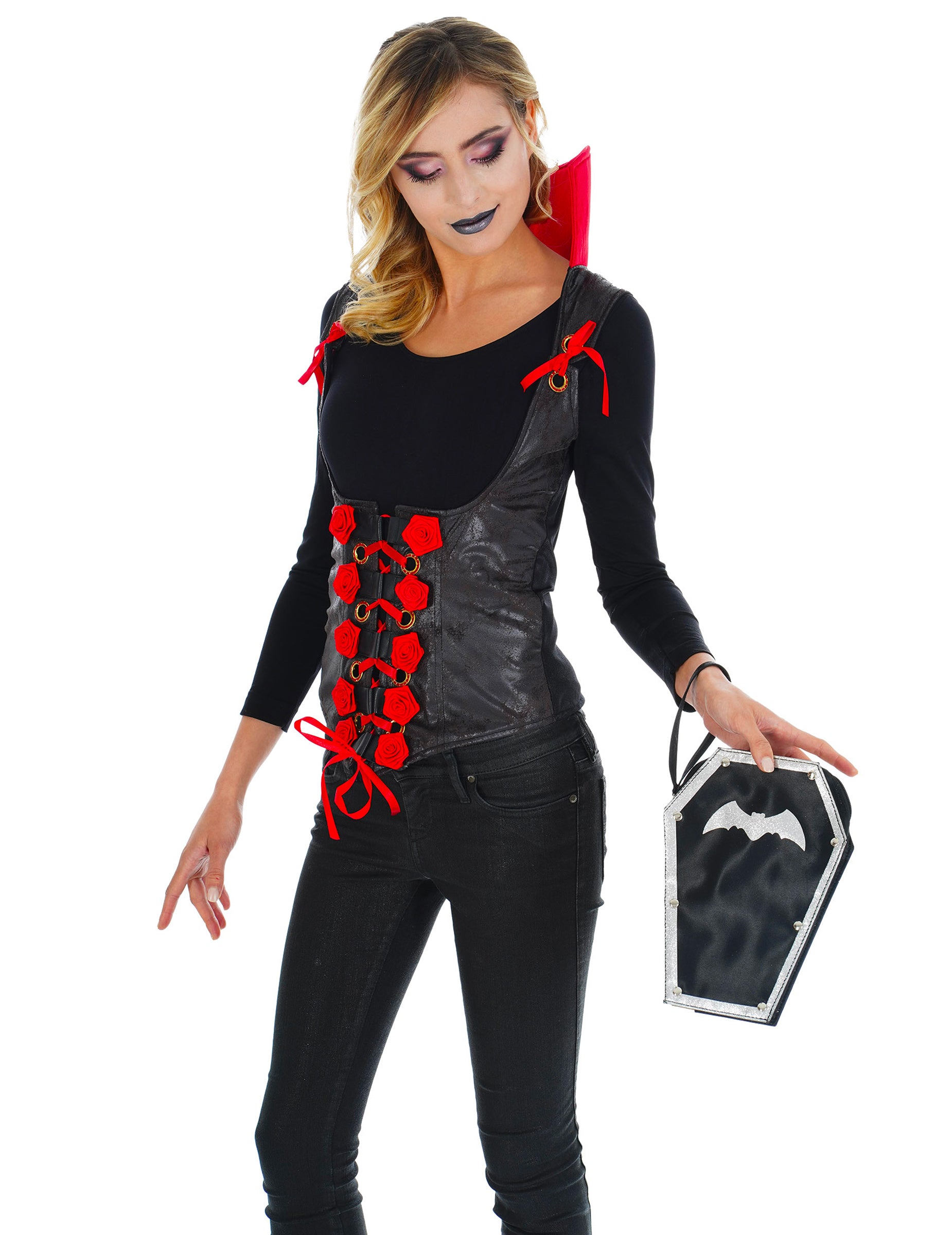 Ova torbica lijesa namijenjena je odraslima. U obliku lijesa, to je crni saten i srebro sa srebrnom palicom. Mala ručka drži je oko zgloba za ultra šik rezultat. Elegantna torba za lijes po volji za dovršavanje vampirske odjeće za svoju večer za Noć vještica!