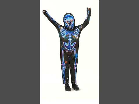 Ovaj kostim neonskog kostura namijenjen je djeci i sastoji se od kombinacije i kapuljače (cipela nije uključena). Kombinacija je crna s tjelesnim otiskom kostura neonskog efekta. Kapuljača je crna predstavlja lubanju kostura s istim učinkom kao i ostatak prerušavanja. To je prerušavanje napravljeno sa 100% recikliranim materijalima. Plastični elementi ambalaže uklonjeni su tako da se može reciklirati. Odlučite se za zelenu Noć vještica s ovom neonskom kostimom skeleta u recikliranoj tkanini!