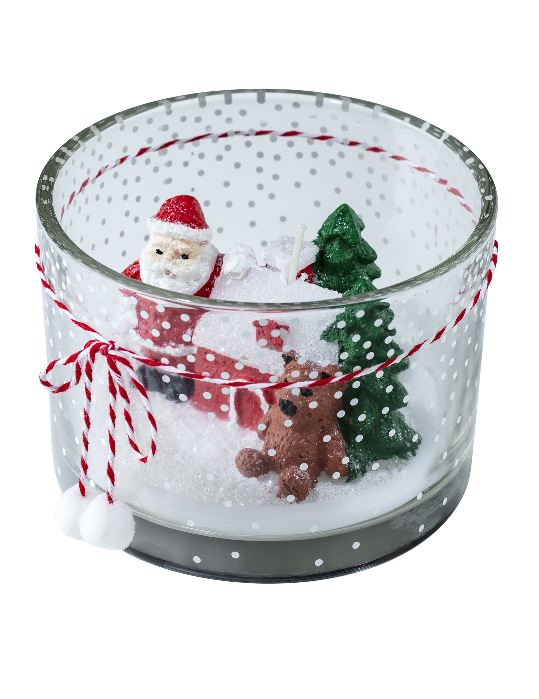 Dodajte dašak čarolije svojim ukrasima za zabavu s ovim svijećnjak u staklu ukrašenom bijelim točkicama i dvobojnom crvenom vrpcom. Unutra, svijeća Ovaj predmet od 130 g otkriva veličanstven zimski prizor s božićnim drvcem, malom kućom i Djedom Mrazom u pratnji polarnog medvjeda. Ovaj dodatak idealan je za stvaranje tople i čarobne atmosfere tijekom vaših božićnih zabava. Božić.