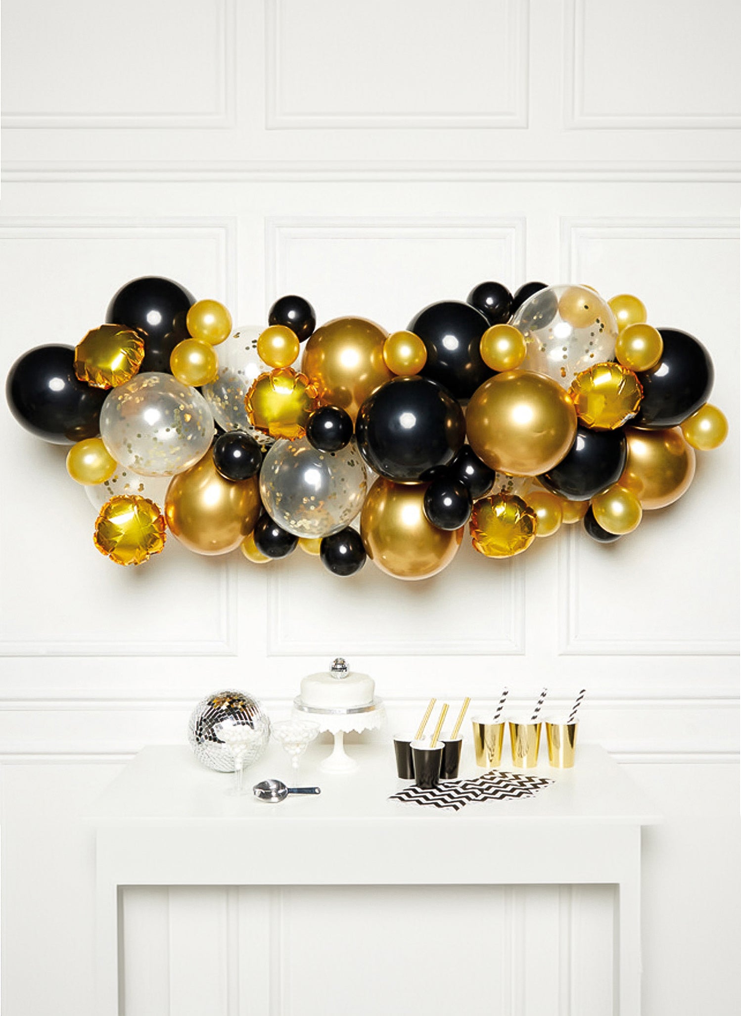 Concevez une décoration élégante grâce à ce kit de 66 ballons conçu pour créer une magnifique arche de ballons aux reflets noir et or. Ce pack complet contient : 15 ballons dorés effet satin (30 cm), 15 ballons noirs effet satin (30 cm), 10 ballons dorés effet satin (27 cm), 10 ballons noirs effet satin (27 cm), 8 ballons transparents avec confettis dorés (27 cm), 6 ballons en aluminium dorés (23 cm), 2 ballons en aluminium noirs (36 cm), ainsi qu'une plaque de points de colle et une ficelle. Mettez en place une arche de ballons chic pour sublimer votre salle lors d'un mariage ou d'un anniversaire inoubliable.
