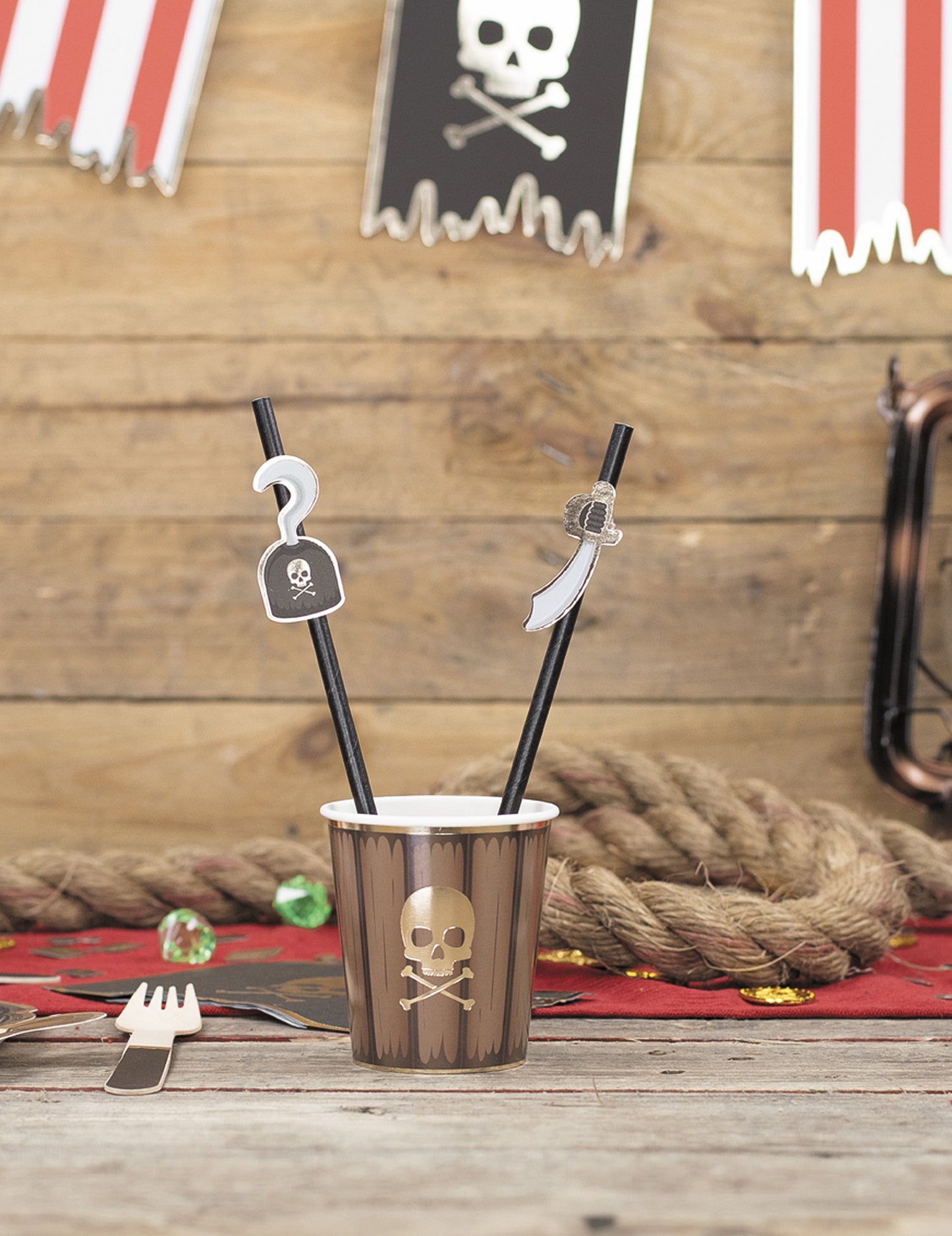 Ova se parcela sastoji od 10 kartonskih slama od oko 20 cm. Crni su i ukrašeni gusarskim uzorcima. Ove će slamke biti savršene za gusarsku rođendansku užinu!