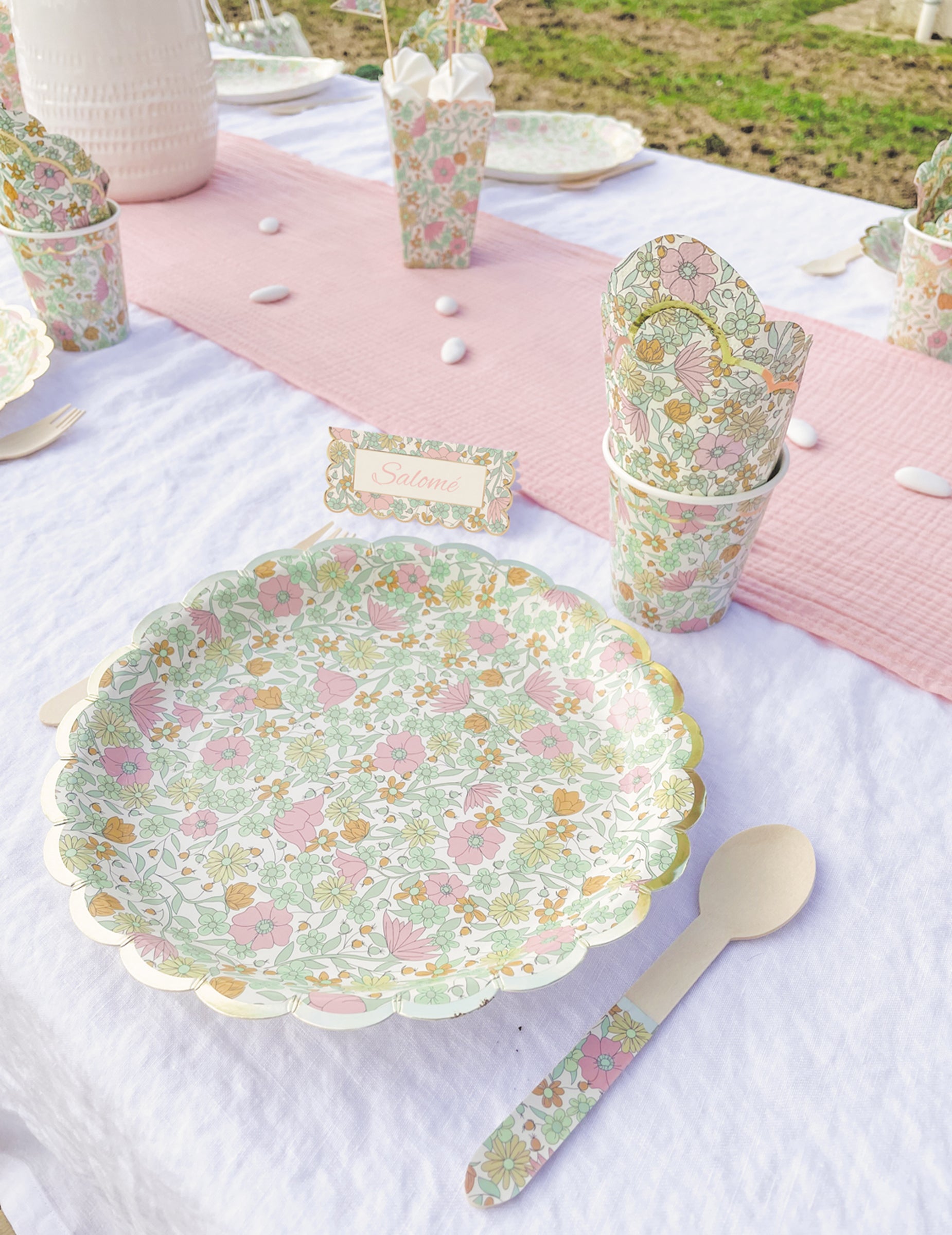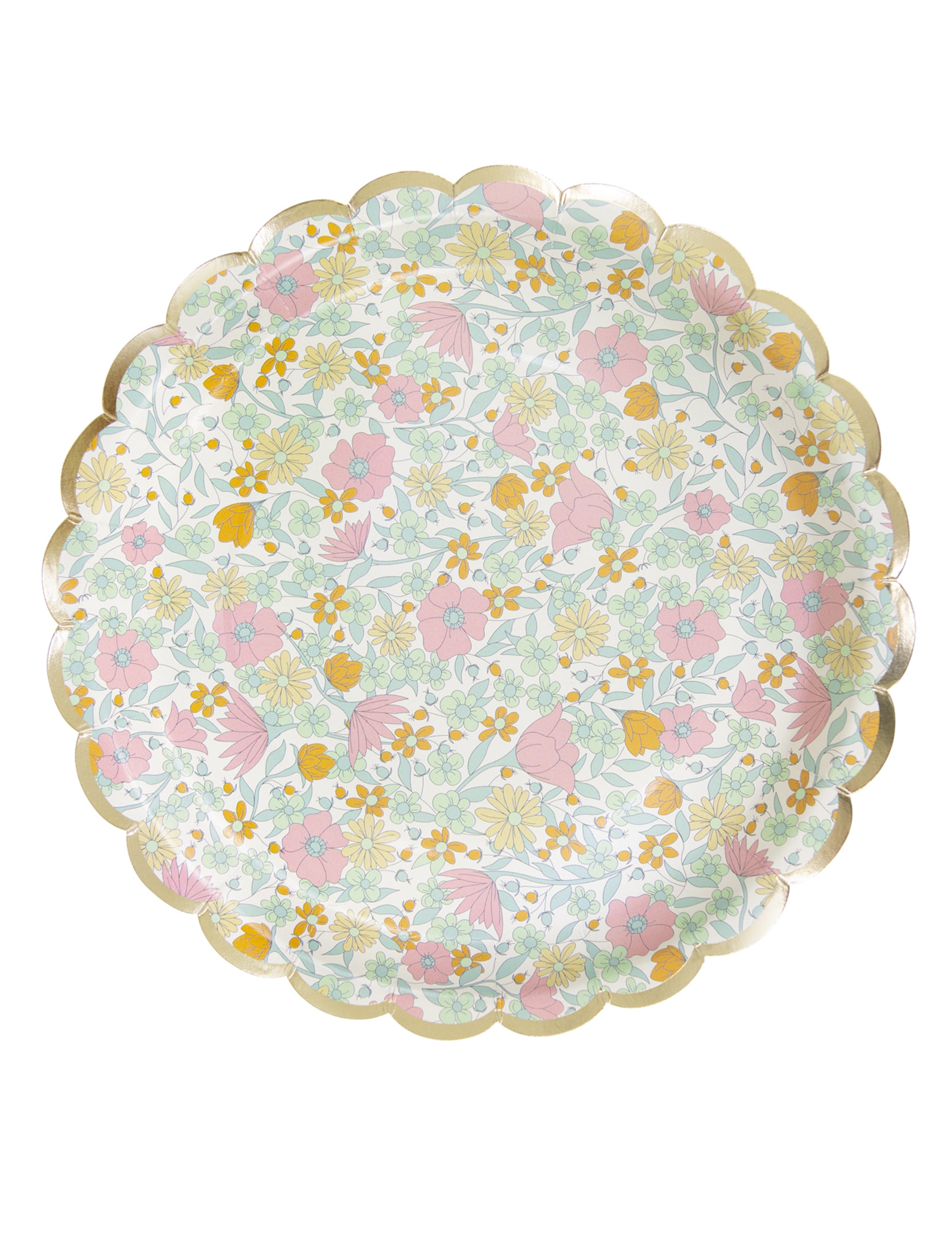 Ulijepšajte svoju dekoraciju stola s ovim setom od 8 kartonskih tanjura promjera 23 cm. Ovi dodaci ističu se zlatnim obrubima valovitog stila i ilustracijama šarenih cvjetova. Ovi shabby tanjuri s vintage šarmom bit će savršen izbor za rođendan u liberty stilu ili bilo koju drugu svečanu prigodu s bukoličnom temom.