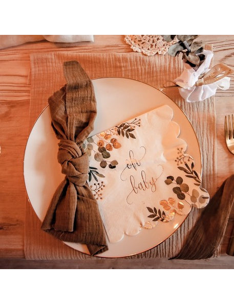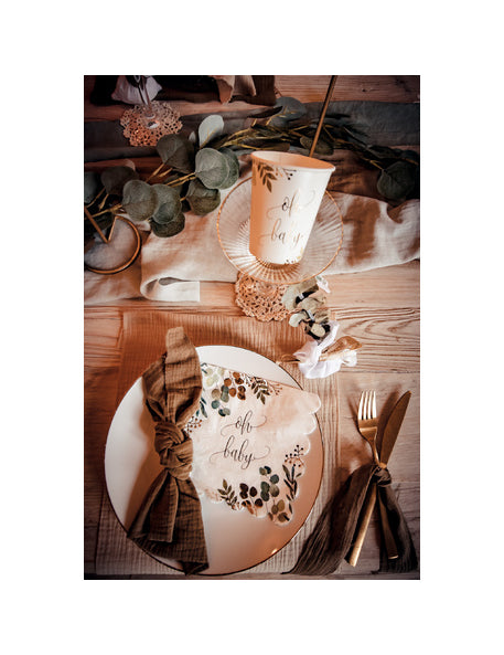 Dodajte dašak slatkoće svom događaju s ovim setom od 16 komada ručnici papir za jednokratnu upotrebu. Svaki komad mjeri 33 x 33 cm Nakon otvaranja, ističe se elegantnim nazubljenim rubovima. Čisti dizajn ima bijelu pozadinu ukrašenu listovima eukaliptusa i natpis "oh baby" svjetlucavim zlatnim slovima. Ovi stolni pribor savršeni su za proslavu baby shower ili elegantnu proslavu za bebu.