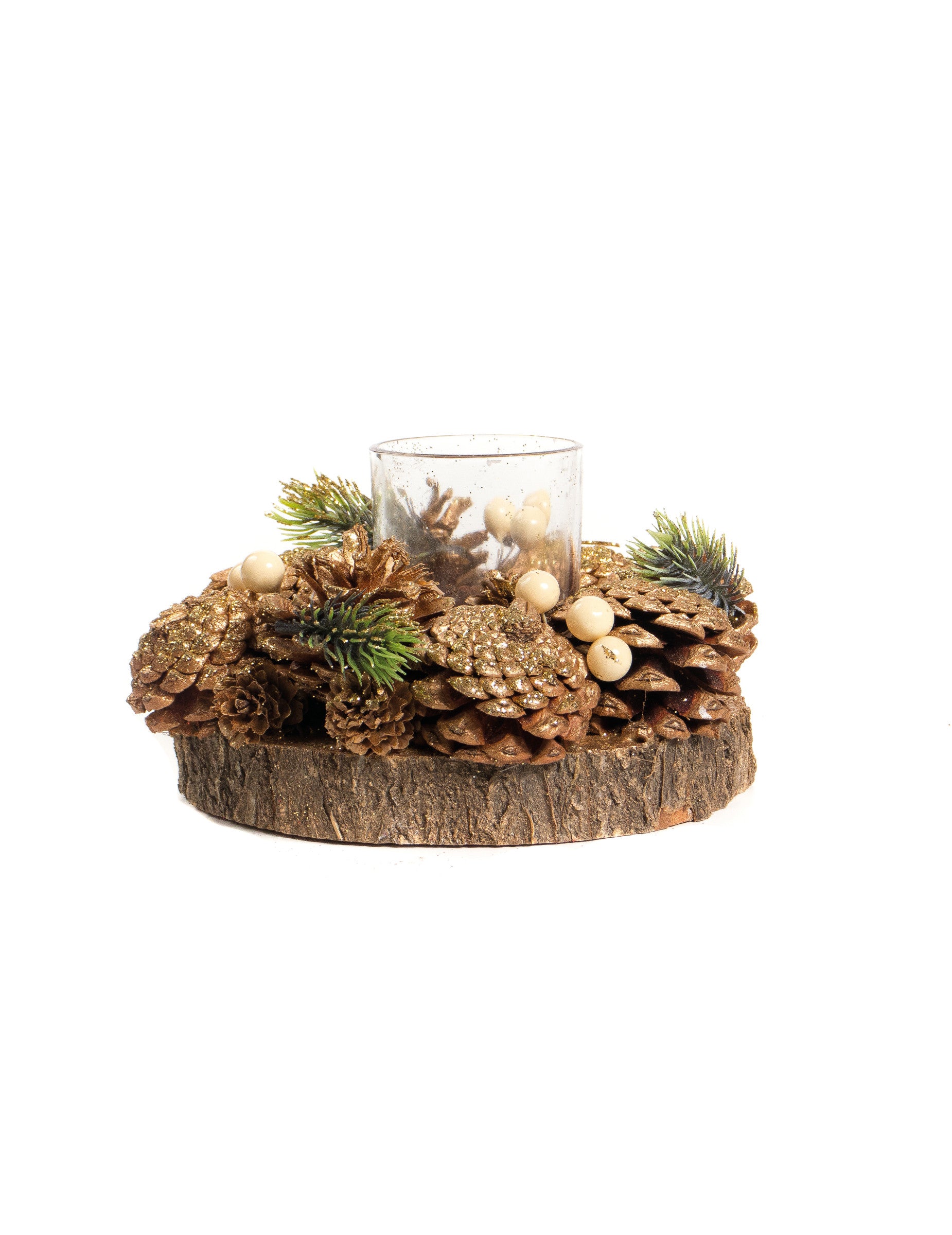 Držač za svijeće od zlatne češere 15 cm na trupcu