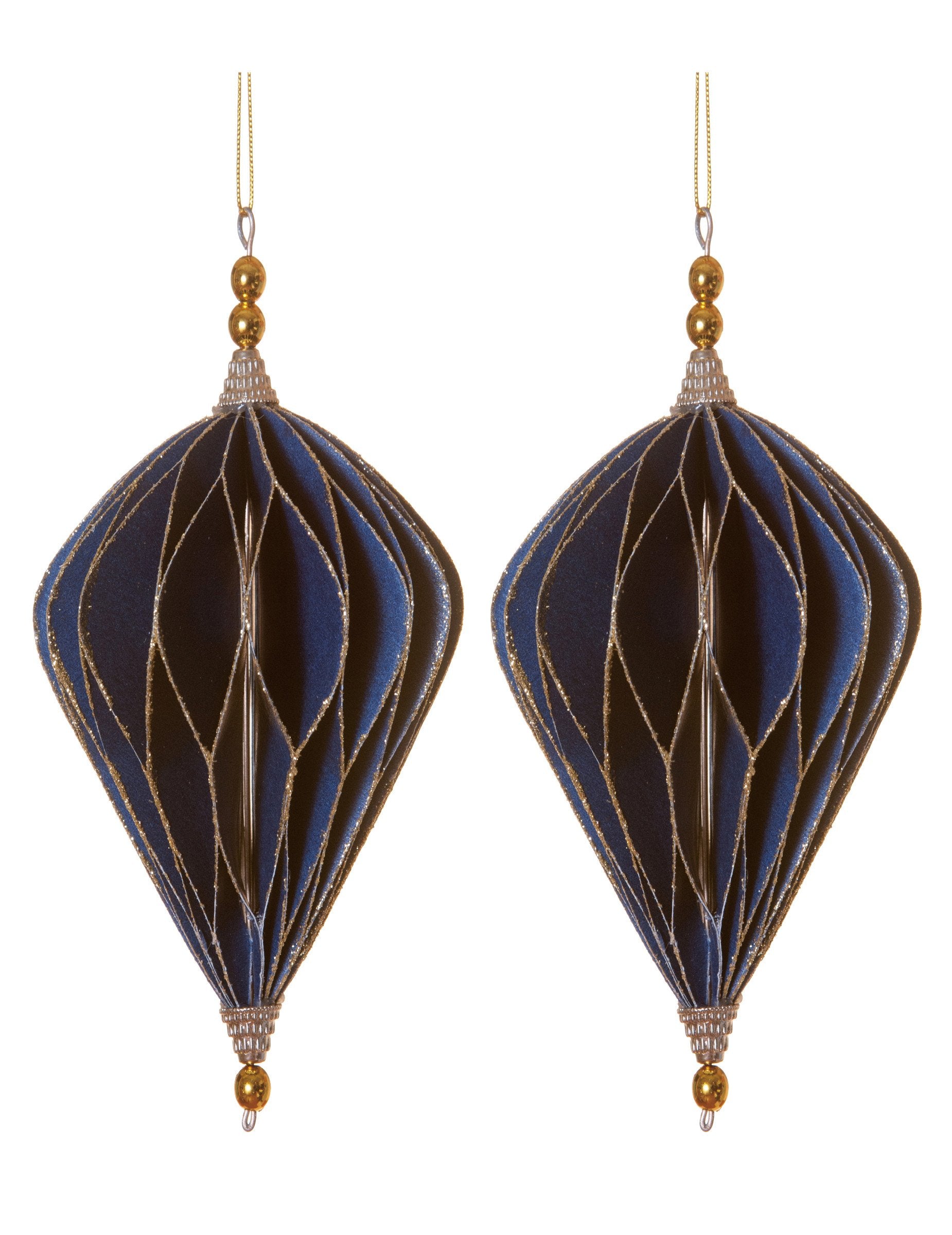 Ce lot contient 2 suspensions décoratives de 13 cm de hauteur. Leur forme de losange et leur effet origami, mêlant le bleu et l'or, offrent un rendu moderne. Ces suspensions sont parfaites pour sublimer votre sapin de Noël avec une décoration chic et lumineuse.