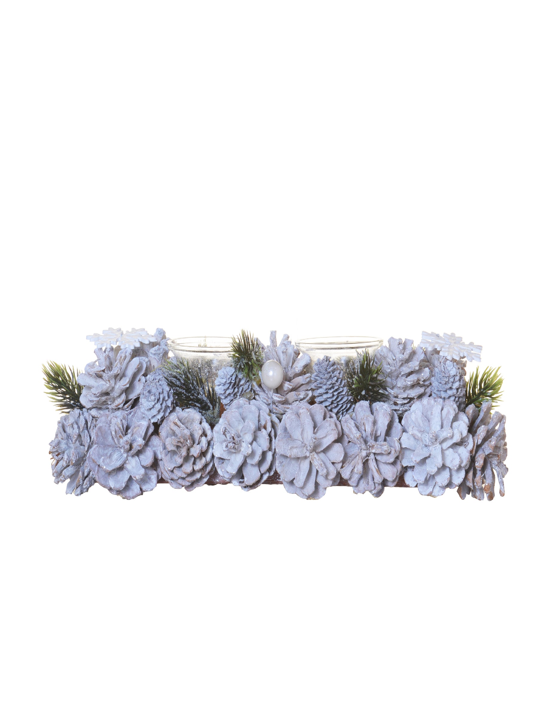 S duljinom od 30 cm, Ovaj središnji ukras uključuje dva svijećnjaci za toplu i privlačnu atmosferu. Njegov zimski dizajn sadrži smrznute borove češere, jelove grančice, bijele kuglice i nježne pahuljice snijega. Nakon što su svijeće na svom mjestu, ovo matirani središnji ukras postat će središnji dio vašeg Božićni stol.