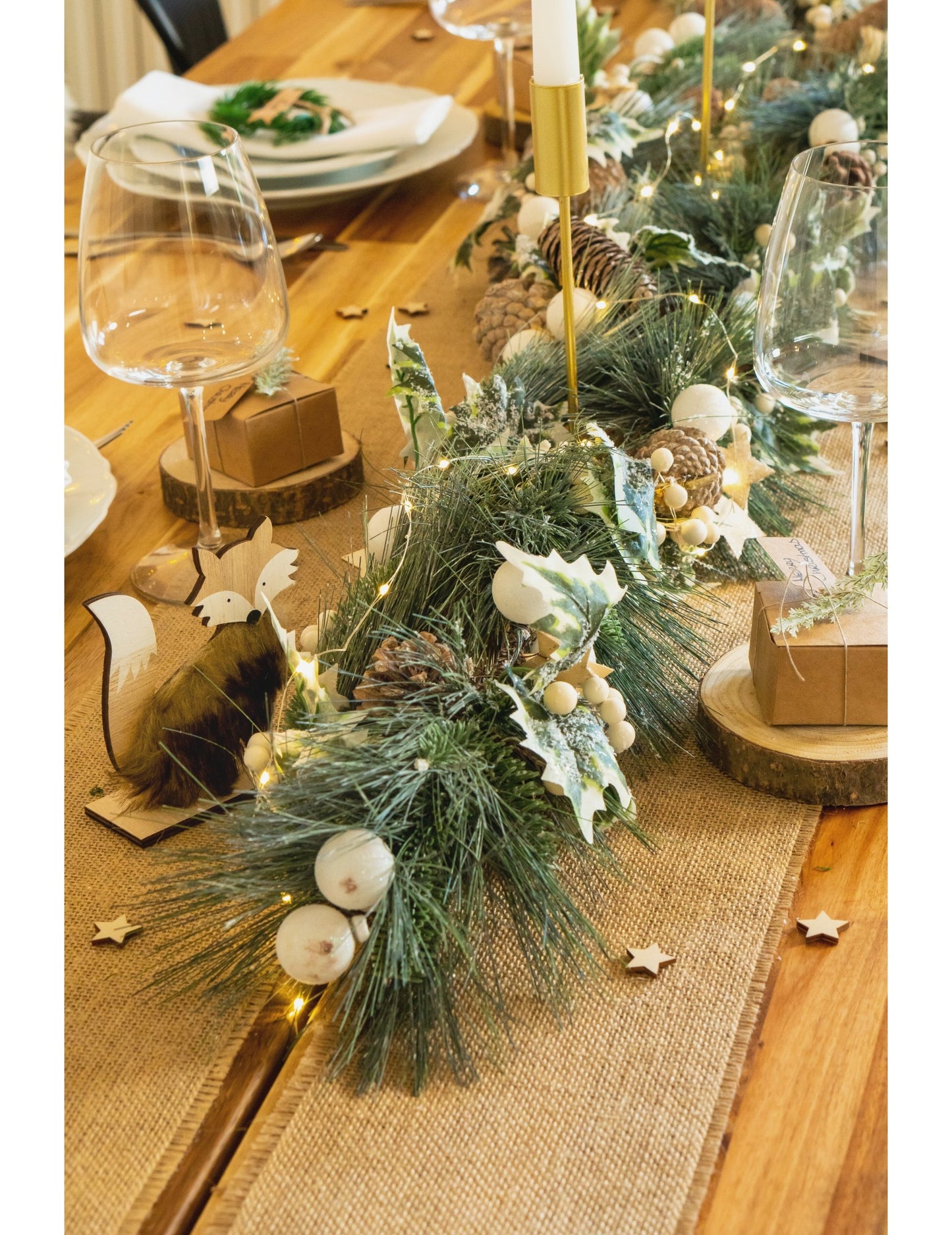 Ovaj vijenac mjeri otprilike 1 m dugačak. Sastoji se od jeoskih grana, lišća, borovih konusa, zvijezda i malih pjenušavih bijelih ukrasa. Ovaj će vijenac dati prirodan dodir vašem božićnom ukrasu!