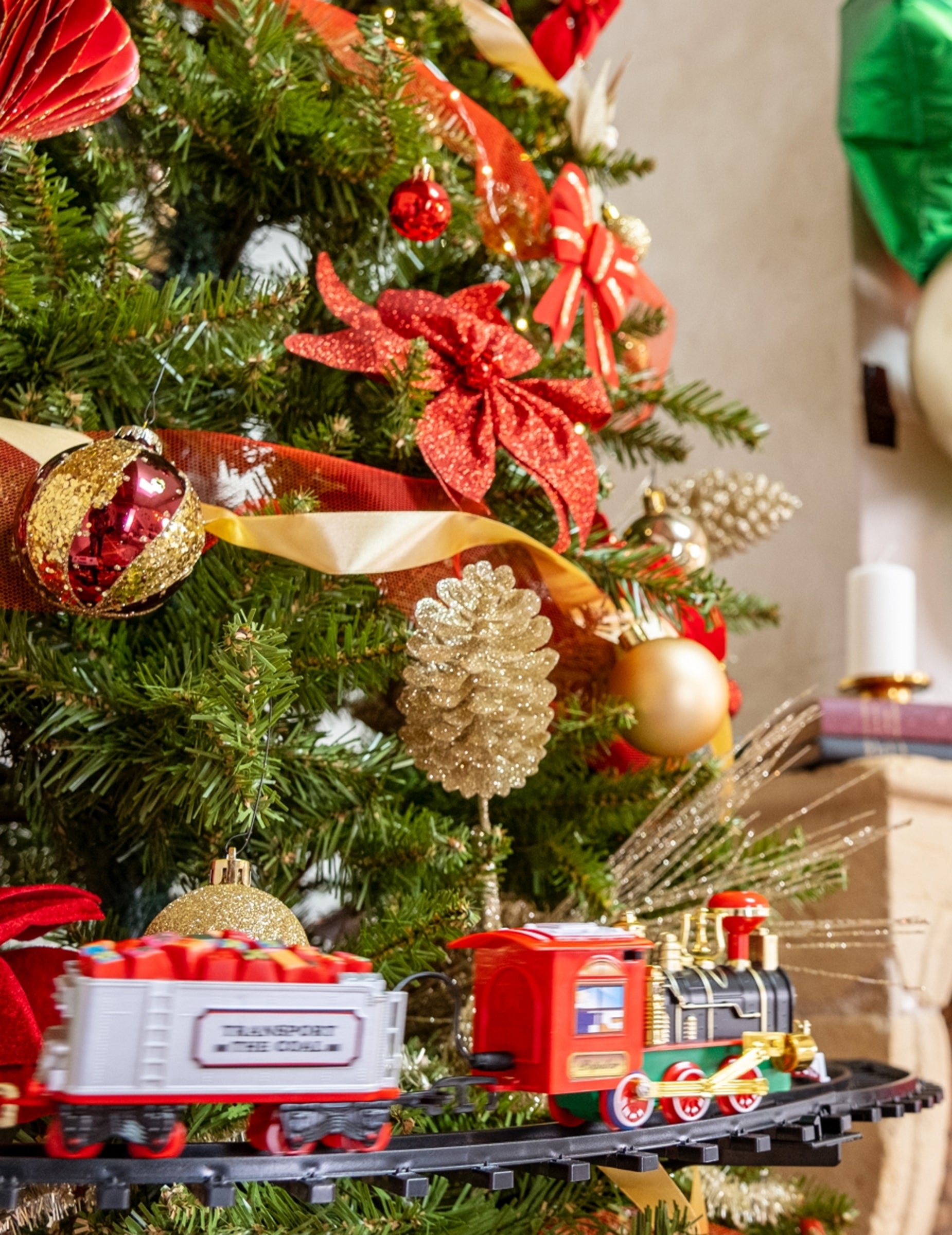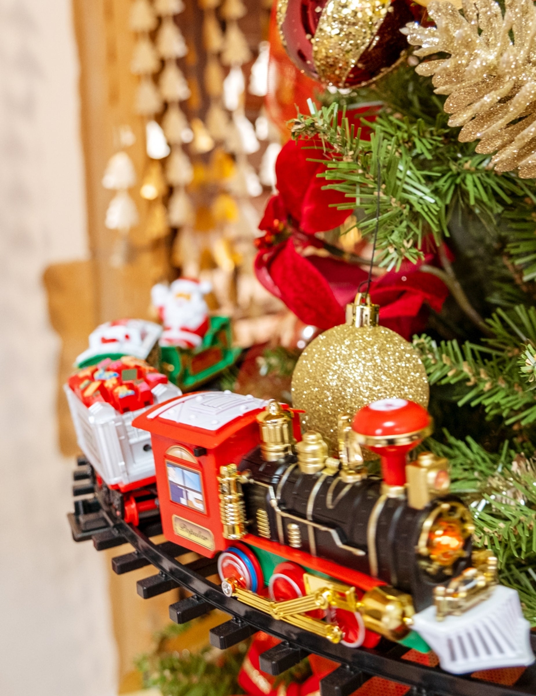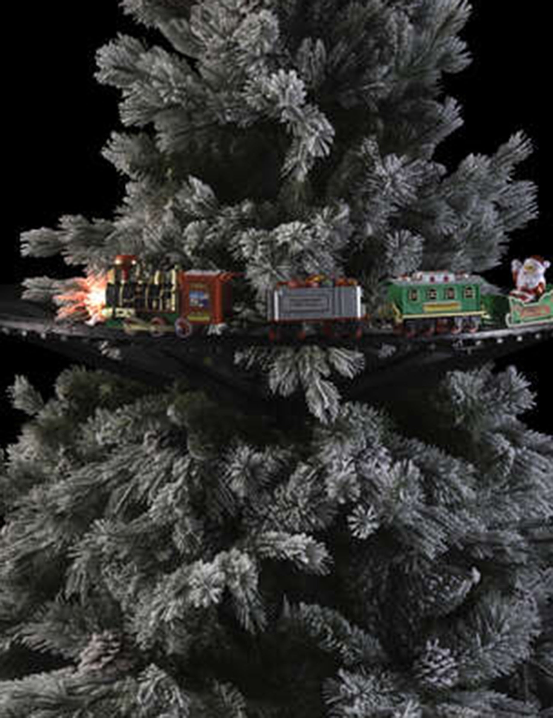 Ovaj svijetli i animirani vlak od 23 komada možete sastaviti. Morate sastaviti 8 komada šine oko stabla prije nego što možete postaviti lokomotivu i 3 vagona. Vlak djeluje s 4 AA baterije (nisu uključene) i mjeri oko 87,7 cm promjera jednom sastavljen. Bit će to središnji dio vašeg jelka za tradicionalnu božićnu atmosferu!