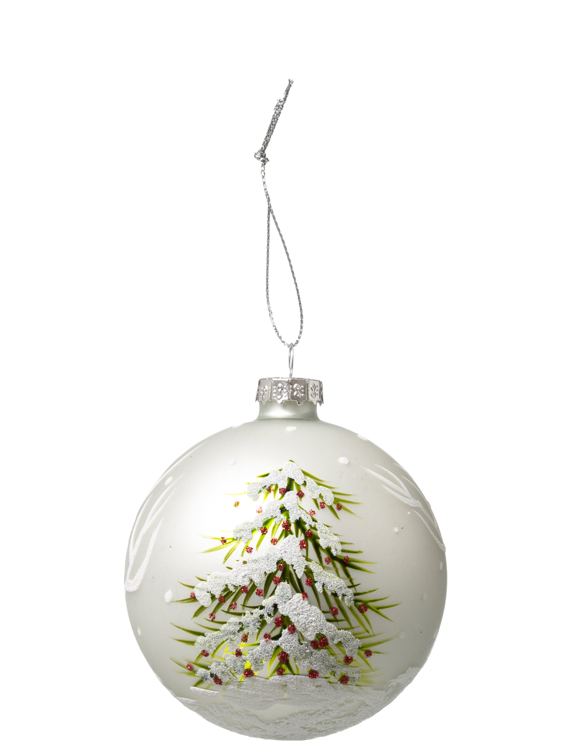 D'un diamètre de 8 cm, cette boule de Noël est conçue en verre blanc. Son décor représentant un sapin a été peint à la main pour un rendu authentique. Des paillettes blanches ont été ajoutées pour offrir un bel effet enneigé à l'ensemble. Parfaite pour parfaire l'ornementation de votre sapin de Noël avec élégance.