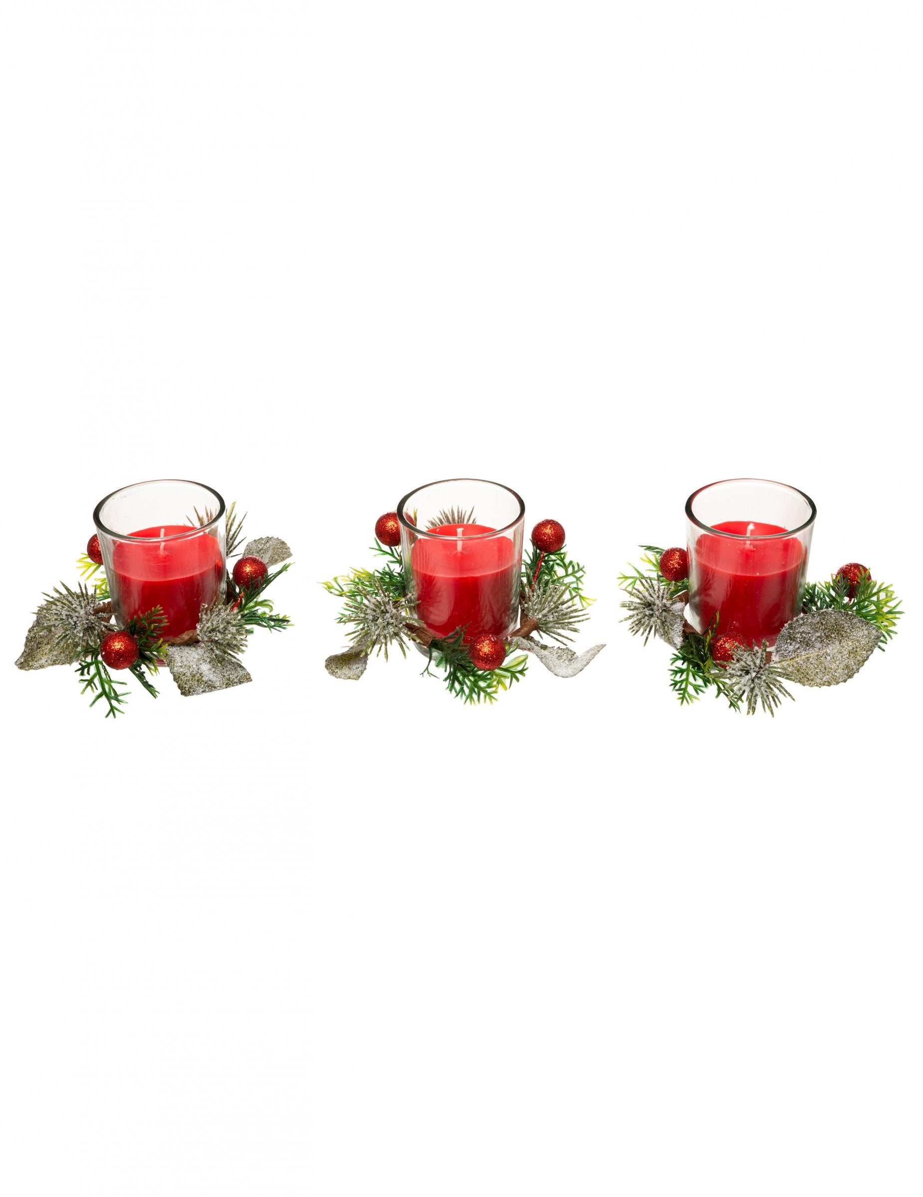 3 crvene svijeće s jeli i bobicama 6 cm