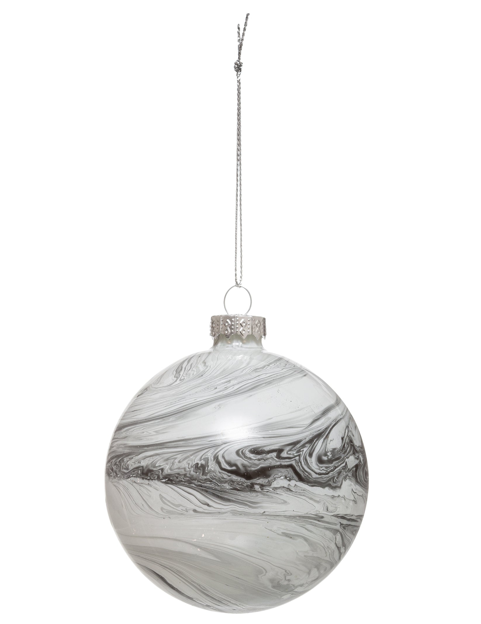 Uljepšajte svoj dekor ovime Božićna kugla dimenzija 8 cm promjera. Ovaj stakleni model ima prekrasan mramorni uzorak u nijansama bijele i sive. Ovo mramorna lopta dodati će dašak šika i modernosti vašem jelka za vrijeme praznika.