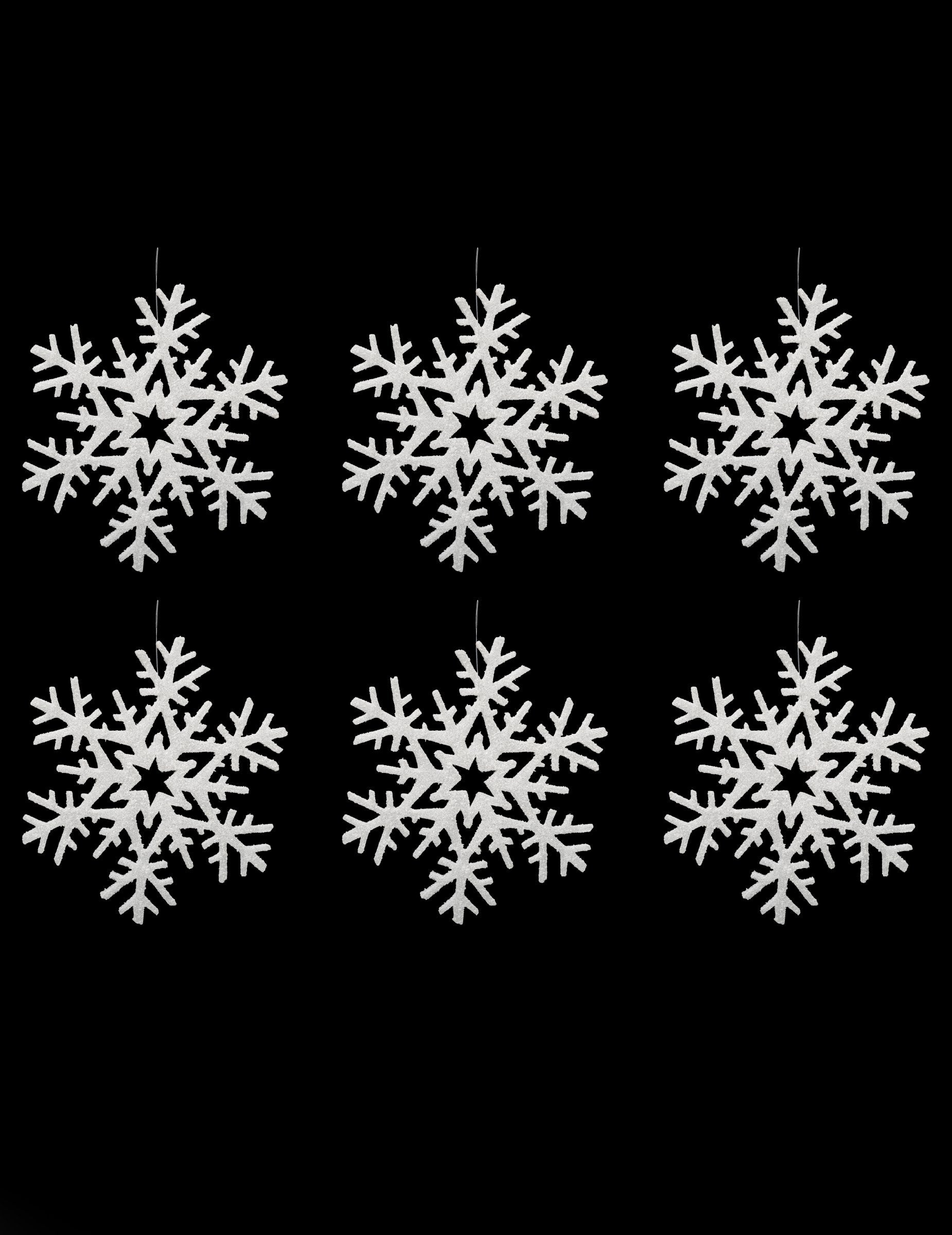 Ovaj set sastoji se od 6 ukrasa koji će se objesiti u obliku pahuljica. Bijeli su sa sjajem i imaju promjer od oko 20 cm. Ove su suspenzije savršene za ukrašavanje vašeg božićnog drvca!