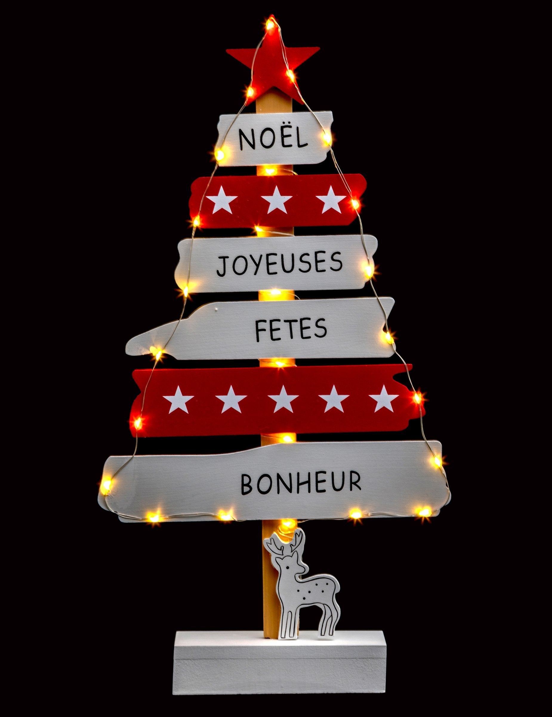 Ce sapin lumineux de 50 x 24,5 cm est l'élément parfait pour créer une ambiance chaleureuse. Il se compose de pancartes aux couleurs rouge et blanc, ornées d'étoiles et de vœux comme "Noël" ou "Bonheur". Une guirlande à led vient entourer la structure (fonctionne avec 2 piles AA non incluses). Idéal pour agrémenter votre table de Noël, optez pour cette décoration sapin lumineuse au style traditionnel.