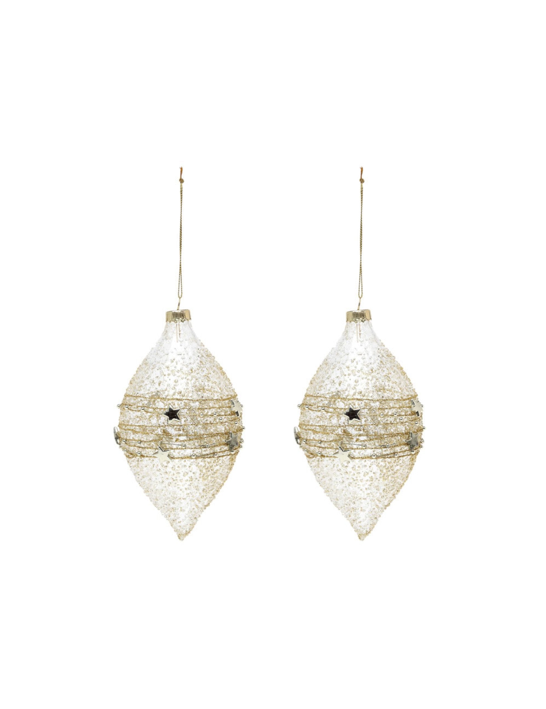 Uljepšajte svoje božićno drvce ovim setom od 2 komada Božićne kuglice u staklu dimenzija otprilike 15 cm. Elegantnog su oblika suze, ukrašene su zlatnim motivima i malim, svjetlucavim zvijezdama. zlatne lopte unijet će magičan i profinjen dodir u vašu dekoraciju Božić.