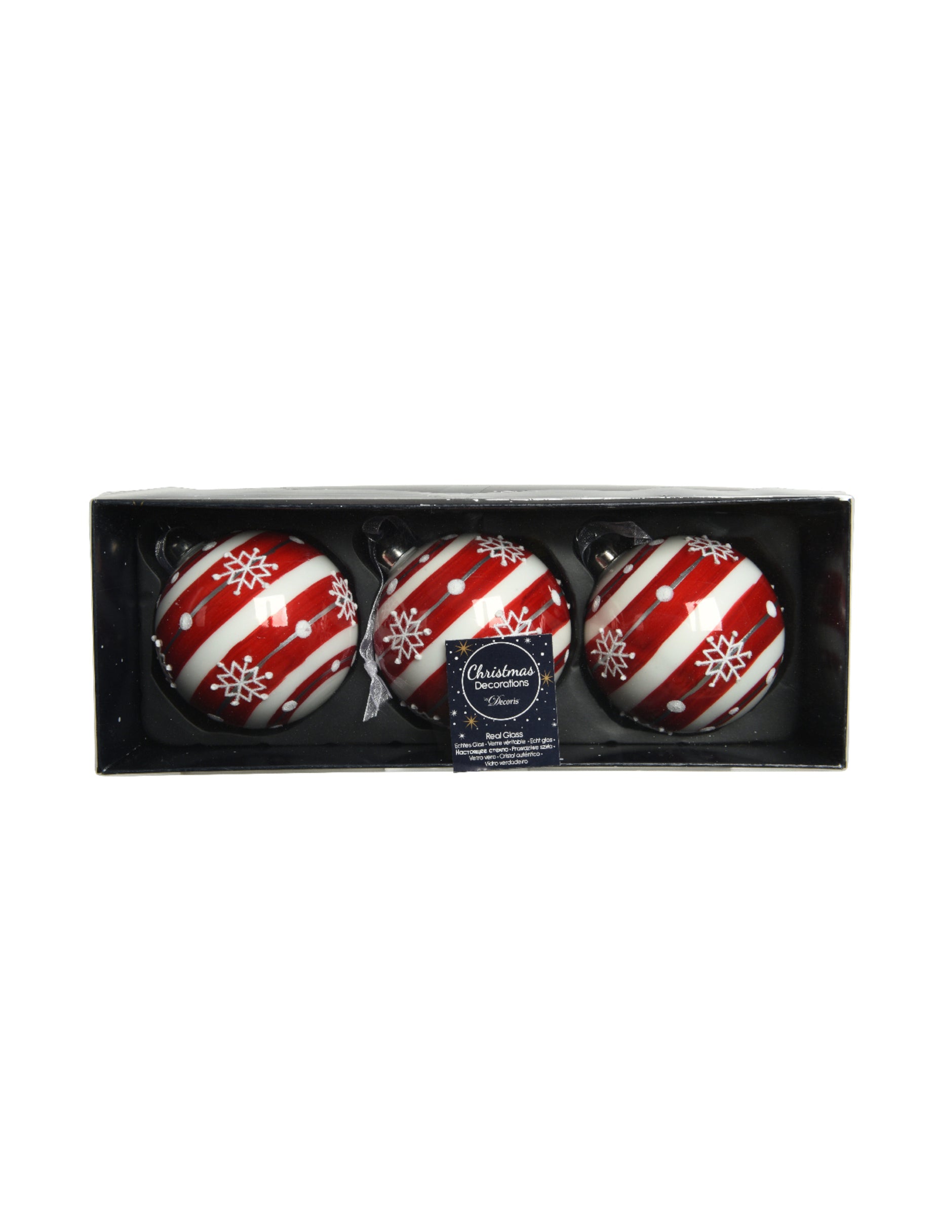 3 staklene božićne kuglice s crveno-bijelim prugama i pahuljama 8 cm