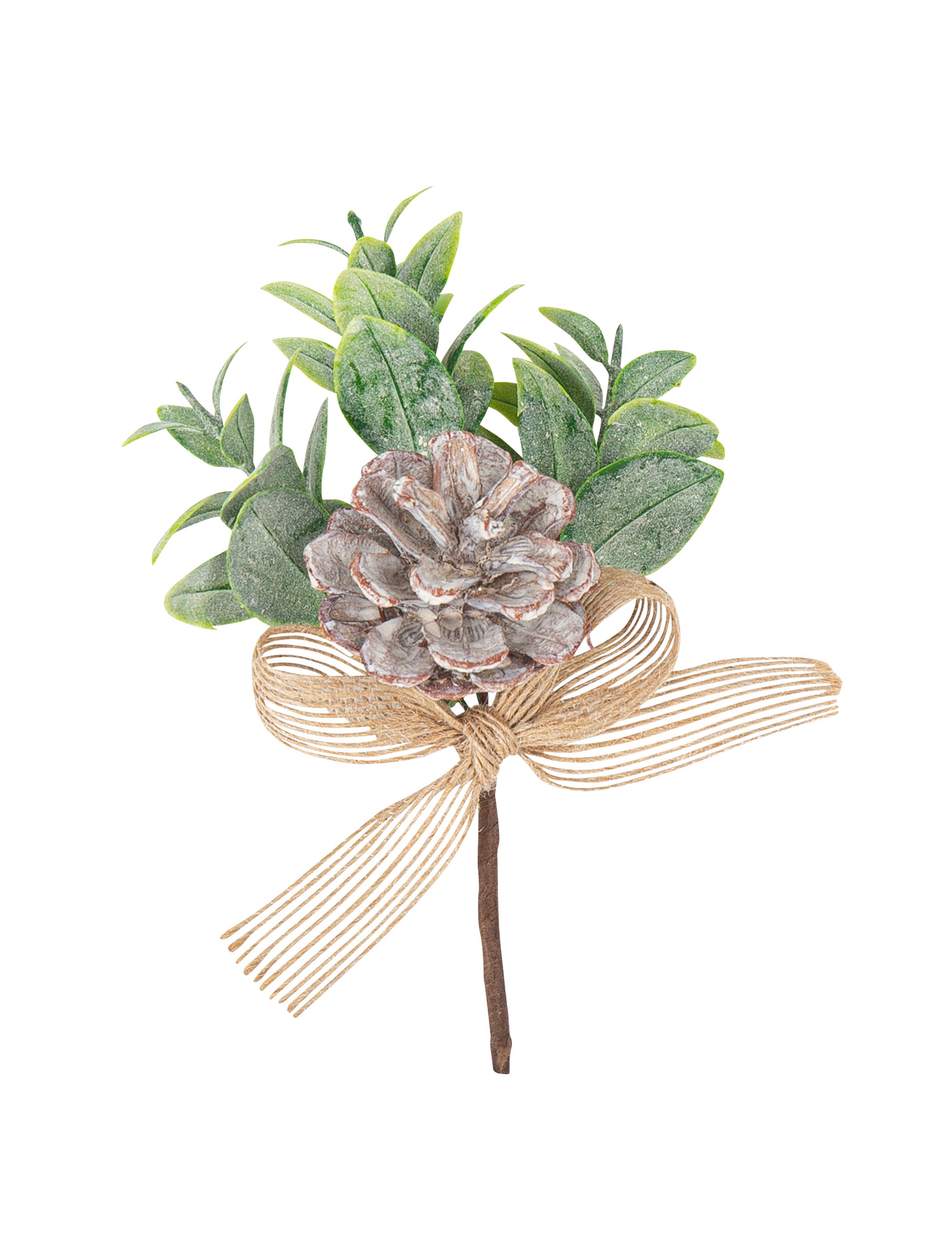 Mjerenje otprilike 14 cm, ovo delikatno podružnica Ovo je savršeno za vaše cvjetne aranžmane. Kombinira listove eukaliptusa, češer s praškastim premazom i elegantnu jutenu kravatu. To je bitan element za ukrašavanje vaših cvjetnih kartica ili salveta. Božićni stol s rustikalnim duhom.