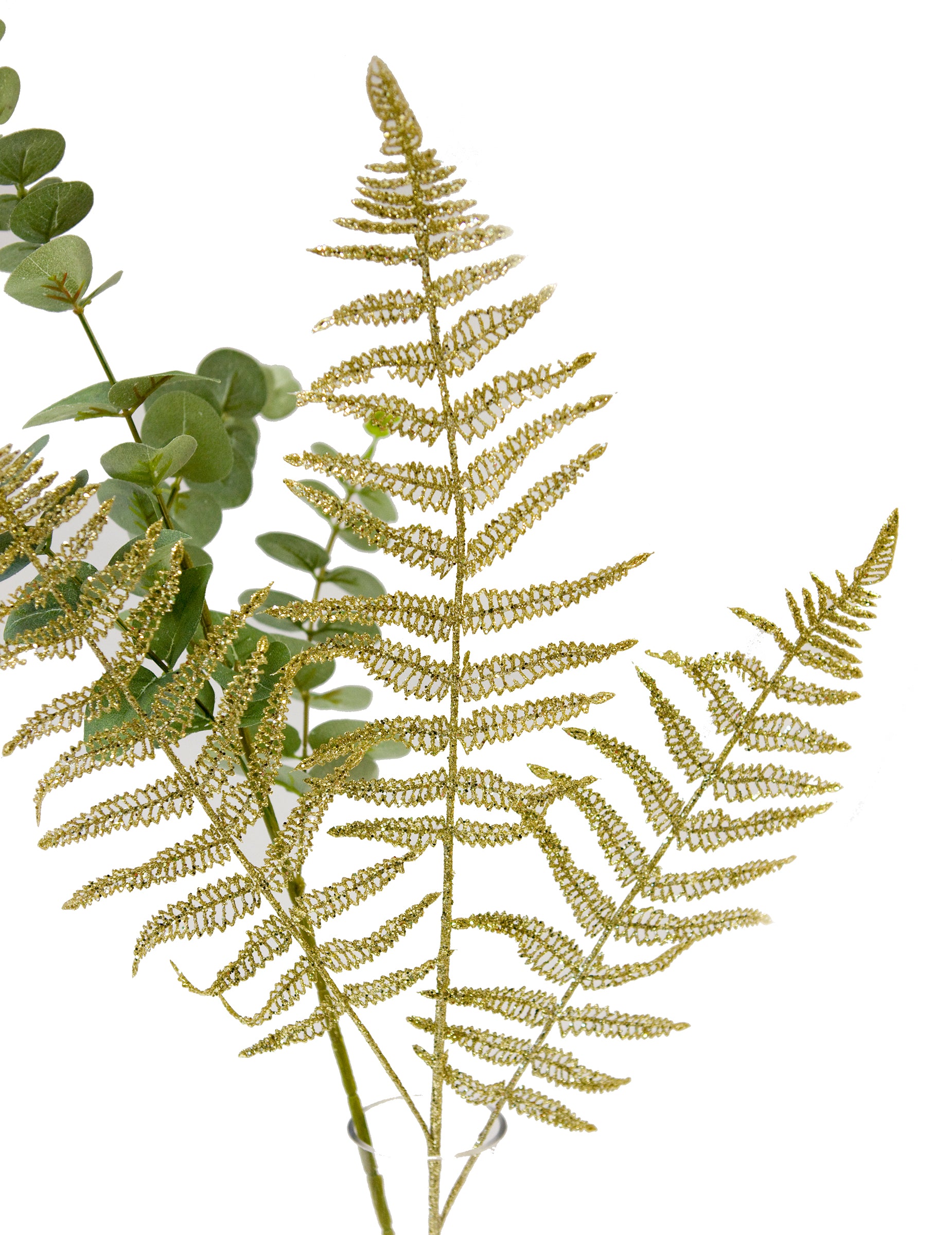 D'une longueur de 77 cm, cette élégante décoration étincelante transformera votre intérieur. Ornée de paillettes or, cette tige de fougère au style moderne est parfaite pour personnaliser votre décor de Noël. Elle s'intègre avec raffinement dans une composition florale au sein d'un grand vase ou s'invite directement comme centre de table pour vos repas de Noël.