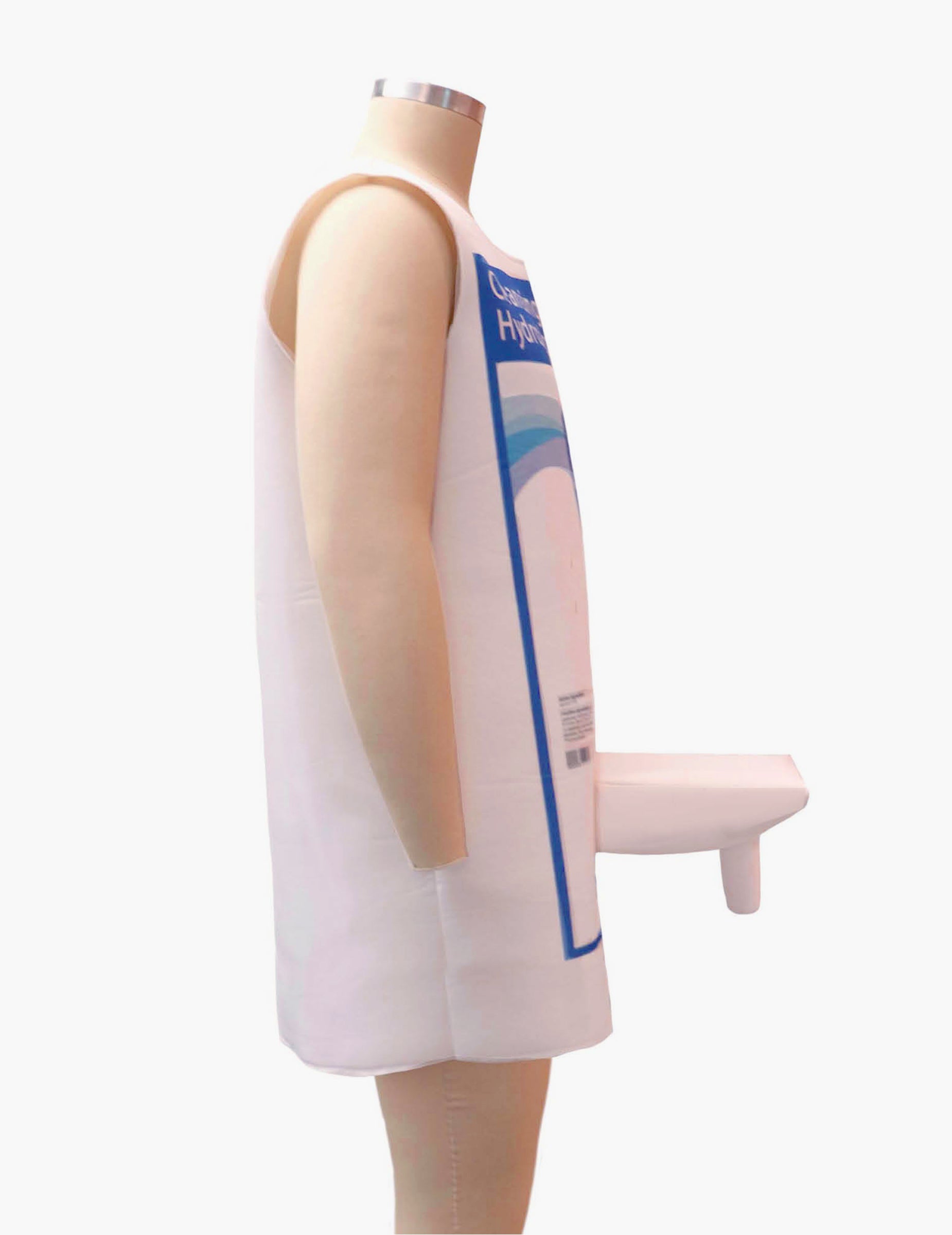 Tunika je bez rukava i bijele je boje. Ima otisnuti dizajn koji podsjeća na etiketu sredstva za dezinfekciju ruku, s plavo-bijelim križem i lažnim barkodom. Na njoj se nalazi natpis "gel za čišćenje ruku hidroalkoholni gel".