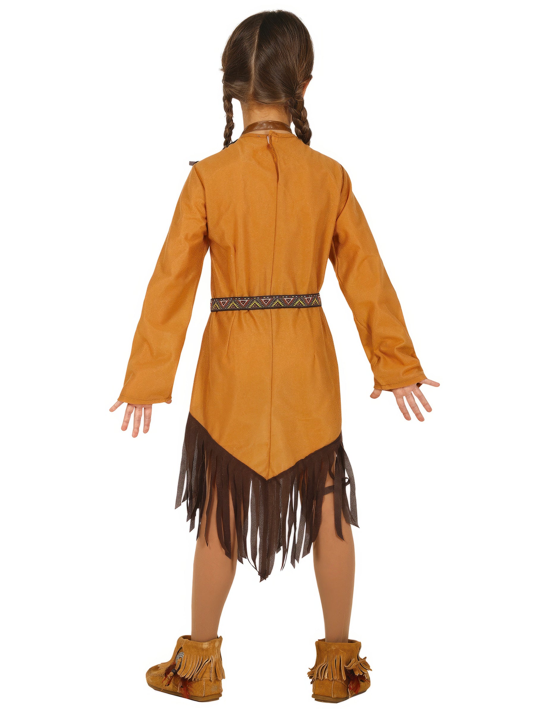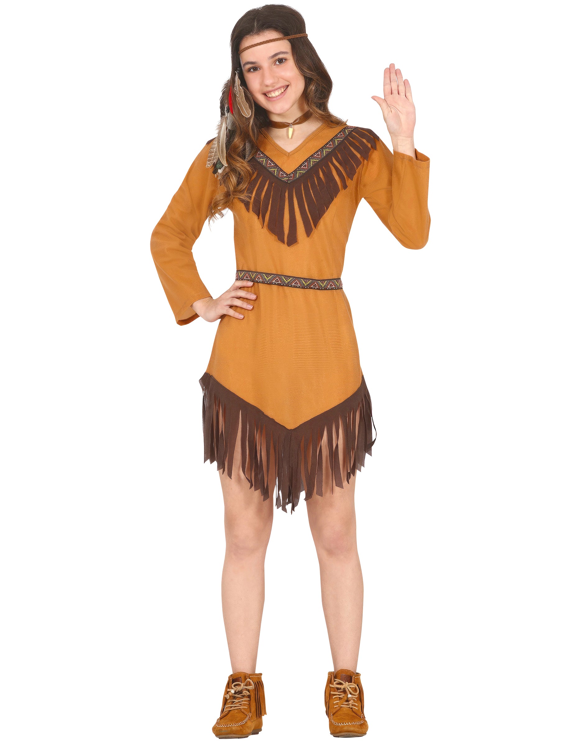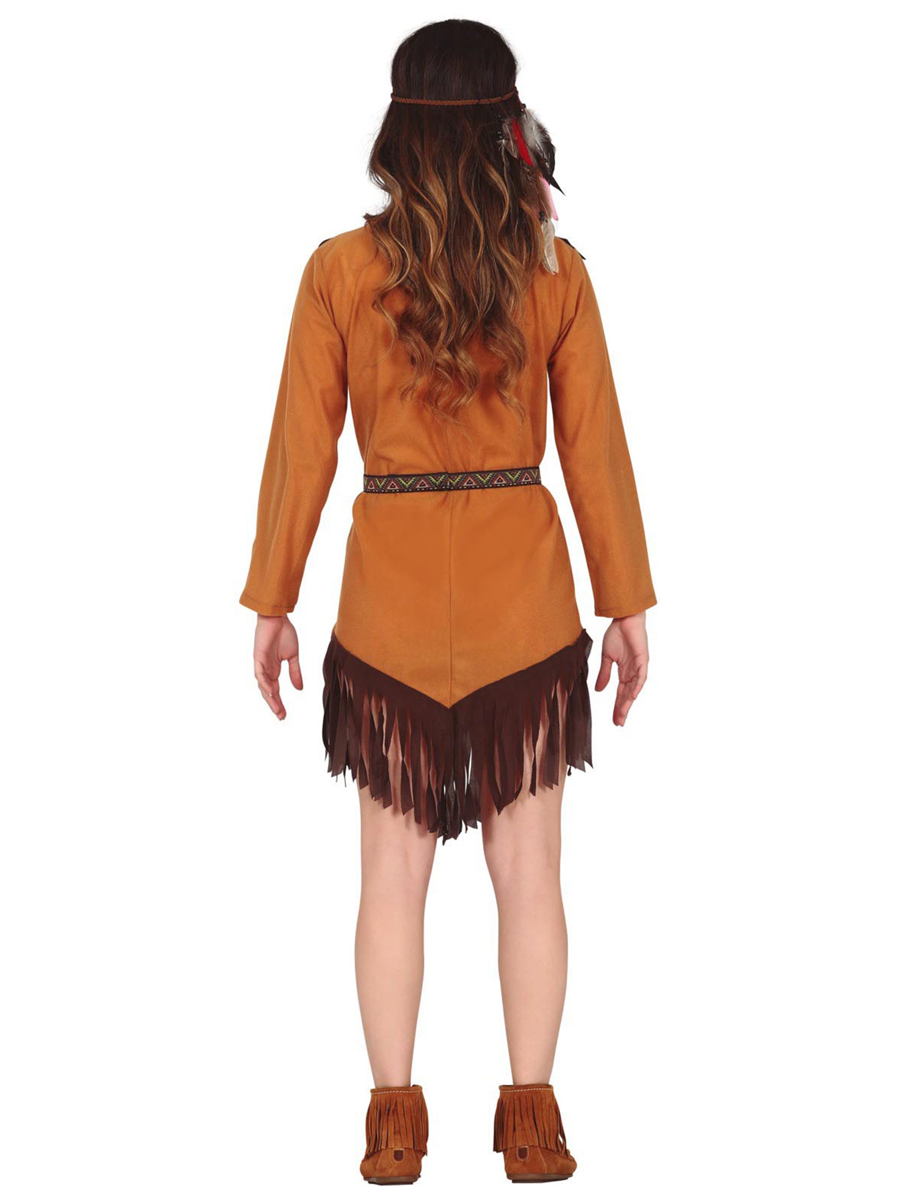Ovaj indijski kostim namijenjen je tinejdžerskoj djevojci. Ima haljinu. Duga haljina je u svijetlosmeđa tkanini s V rezanjem na ovratniku i suknji. Prilično tamno smeđe rubove prisutne su na ovratniku i dnu haljine za najrealniji učinak. Konačno, istaknuti su obojeni uzorci i uzorci i struk. Indijski kostim idealan je za proslavu karnevala ili bilo koje druge prikrivene večeri.
