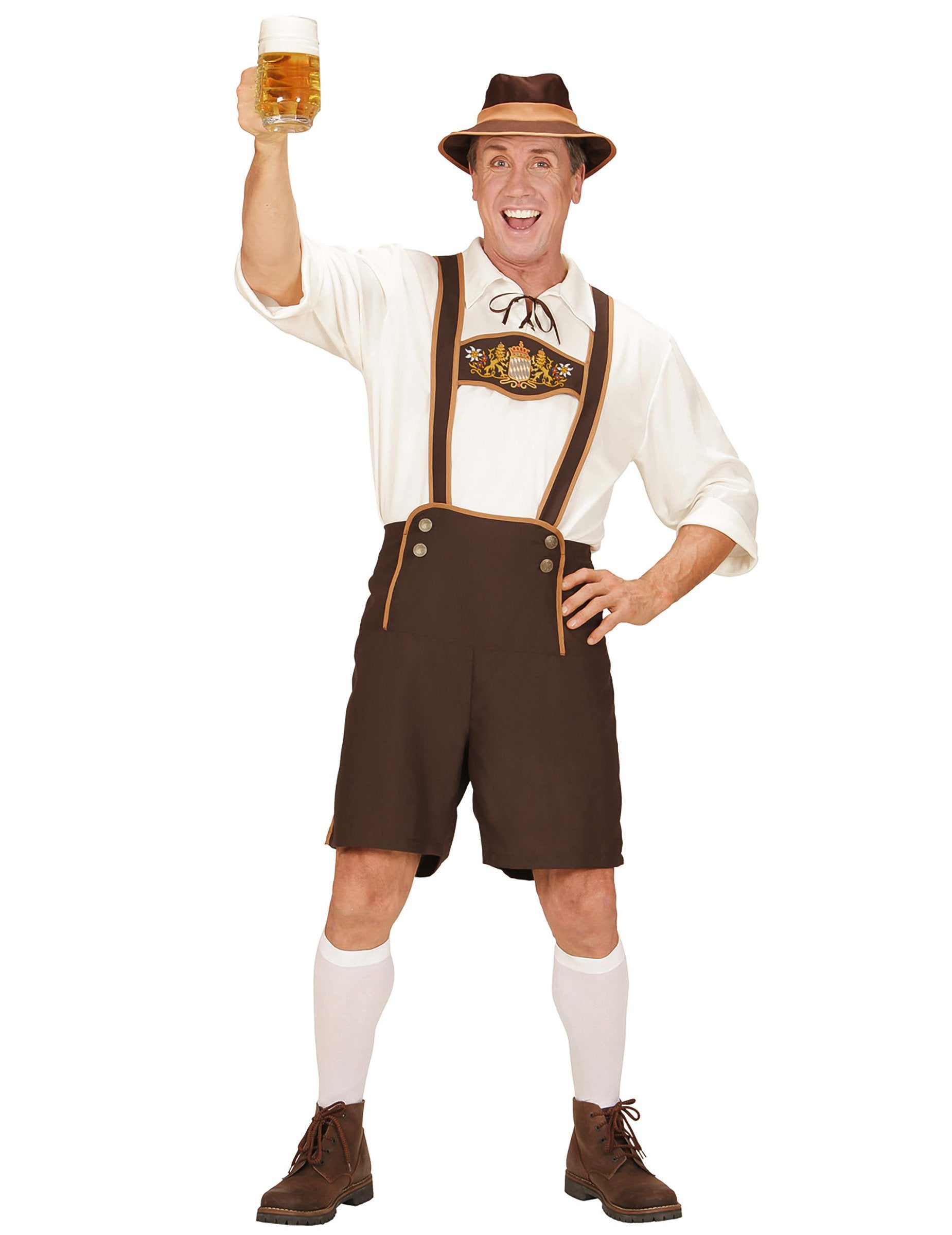 Ova velika smeđa smeđa prerušavanje je za muškarce. Uključuje kombinezon, košulju, čarape i šešir. Smeđe kombinezone podvučene su zelenim vezama. Kratko je i stići će tik iznad koljena. Razlozi su također prisutni na vrhu. Dodaju se bijele čarape. Bijela košulja dovršit će ovaj set. Konačno, smeđi šešir donijet će konačni dodir ovom bavarskom kostimu! Cé prerušavanje Bavarijana u velikoj veličini bit će savršeno za slavlje zabave na temu piva ili za prikriveni događaj!