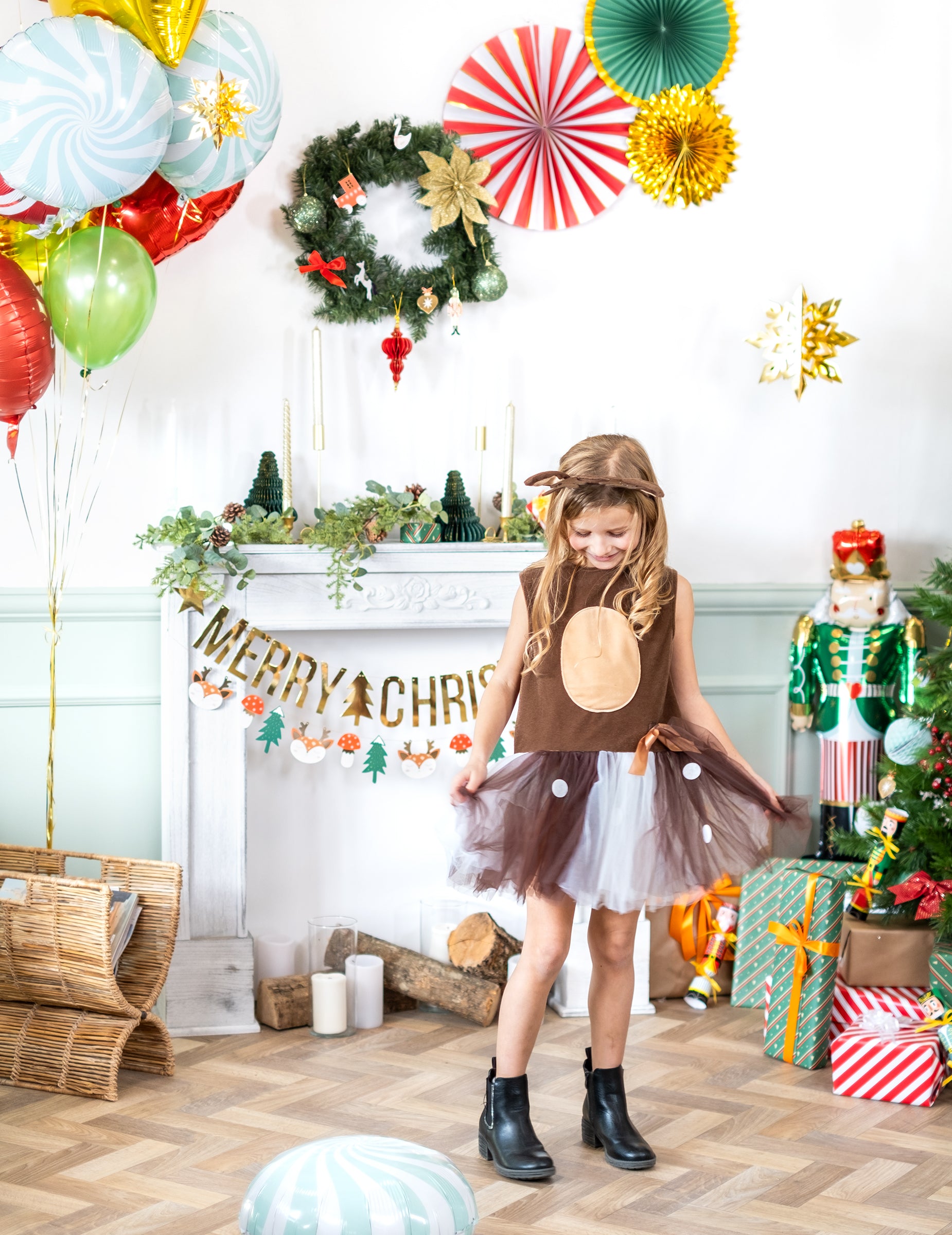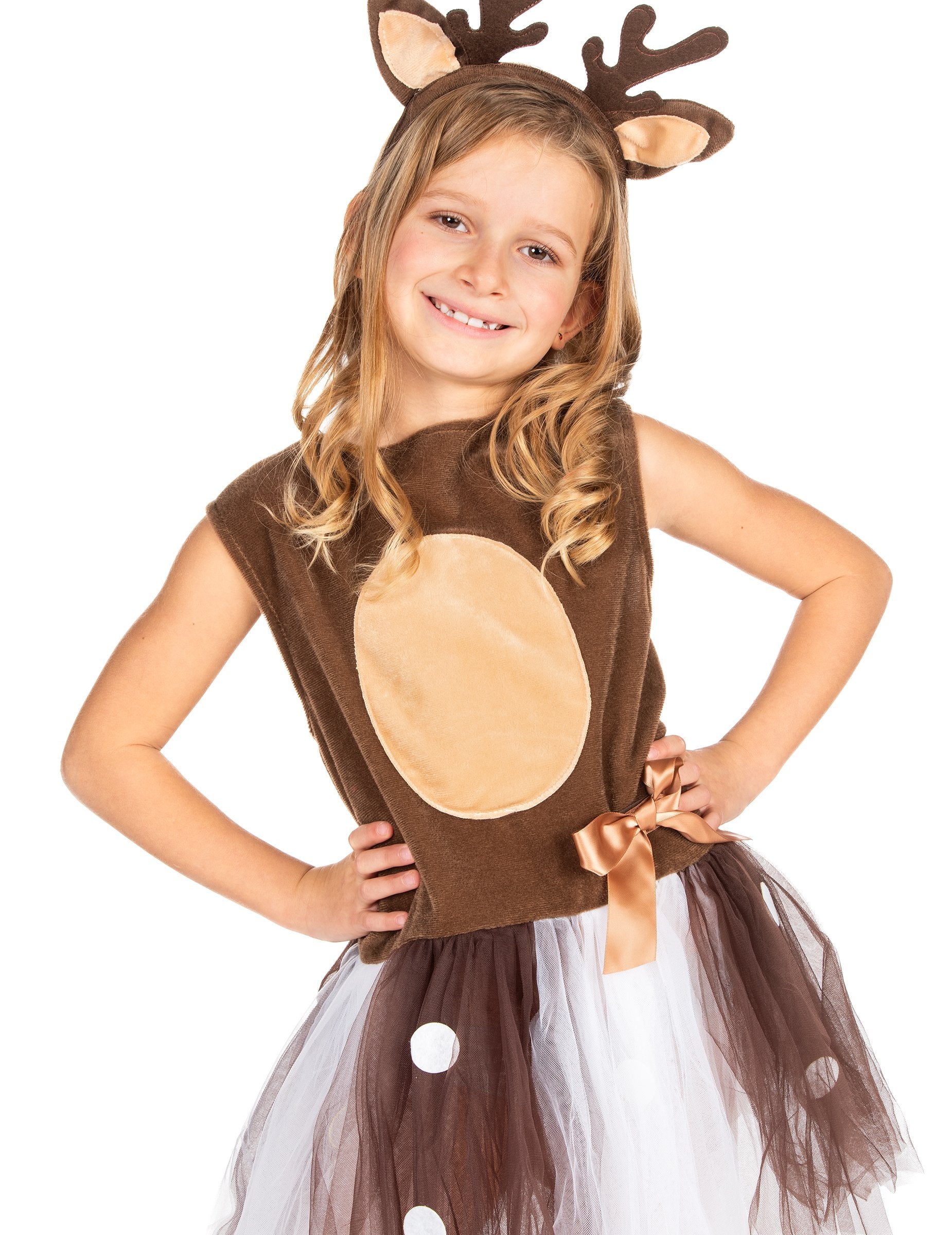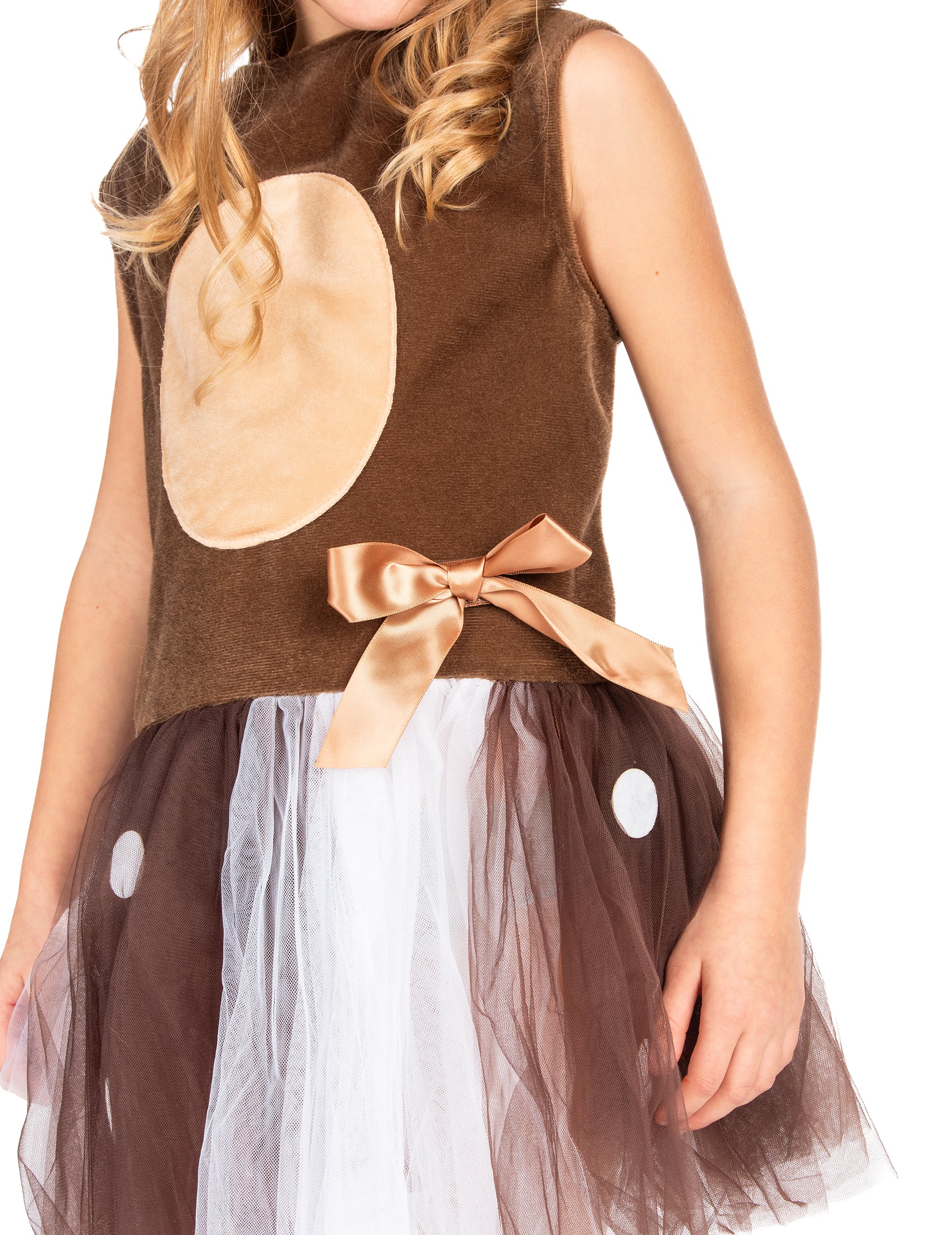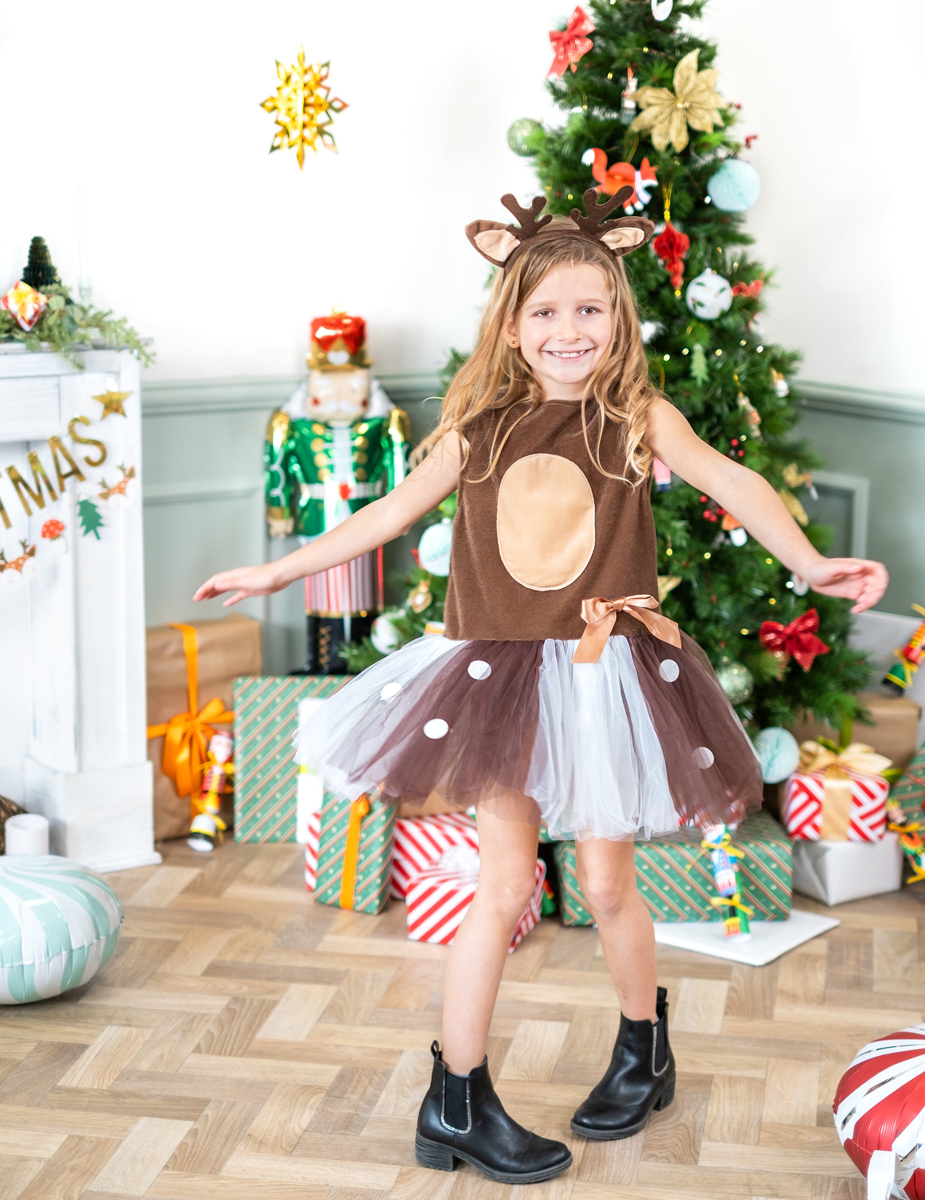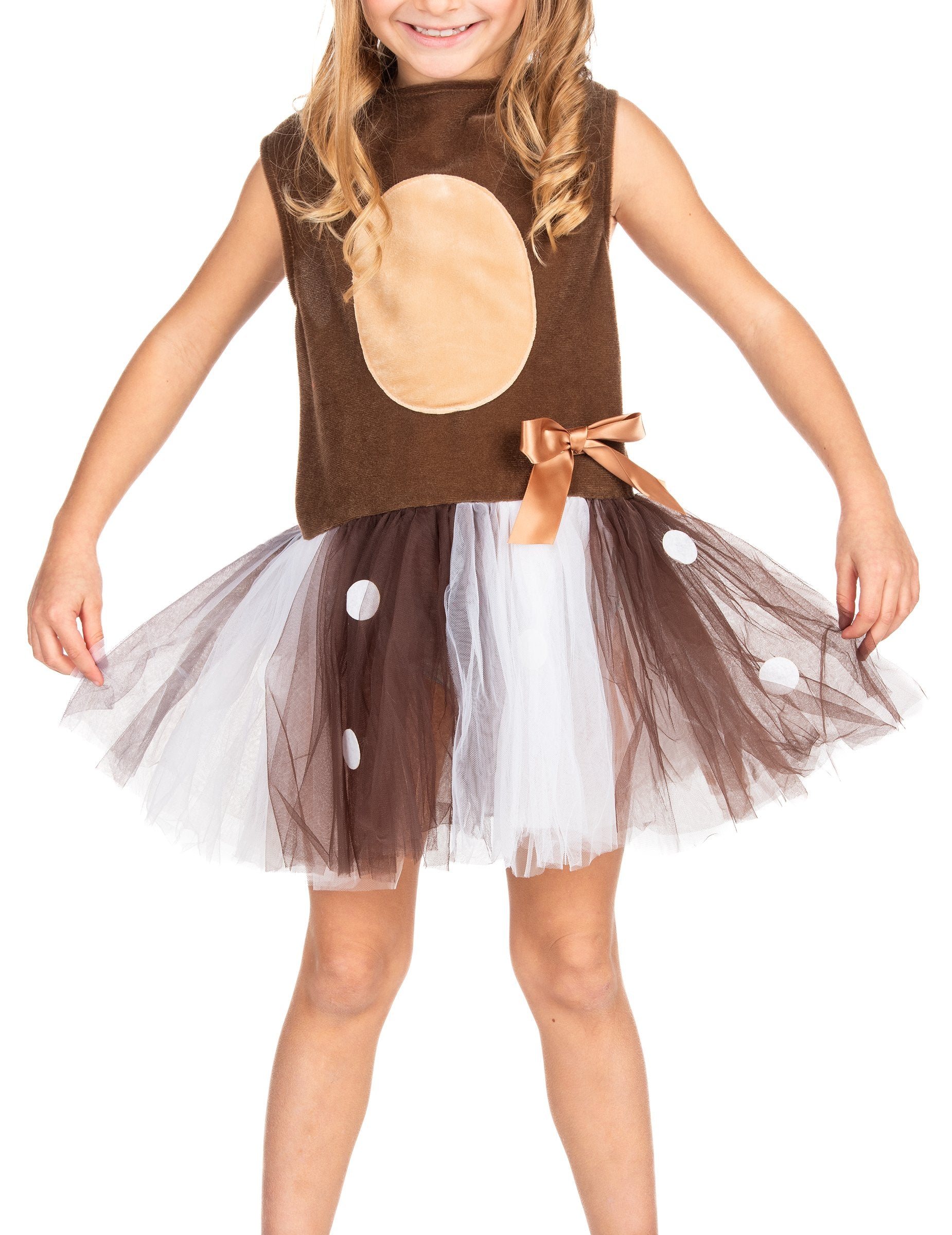 Ovaj mali tutu prerušen je za djevojku. Uključuje tutu haljinu i traku za glavu. Vrh djevojčine haljine je smeđe boje i ima raznobojnu natečenu suknju od tila (ružičasta, smeđa, bijela). U cjelini se dodaje traka za glavu, odgovara haljini i nadahnuta je šumama i ušima božićnog jelena. Jamči svom djetetu šareno Badnjak tijekom božićne zabave!