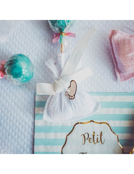 Dodajte dašak slatkoće svojim posudama s ovim pakiranjem od 10 komada oznake dimenzija 3 x 1,7 cm. Ovaj set nudi tri različita dizajna: jedan tijelo ružičasta i zlatna, prugasti model i malo stopalo Elegantna bijela. Za jednostavnu ugradnju, u kompletu su uključene bijele satenske vrpce. Ovi mali ukrasni elementi savršen su izbor za proslavu baby shower sa stilom.