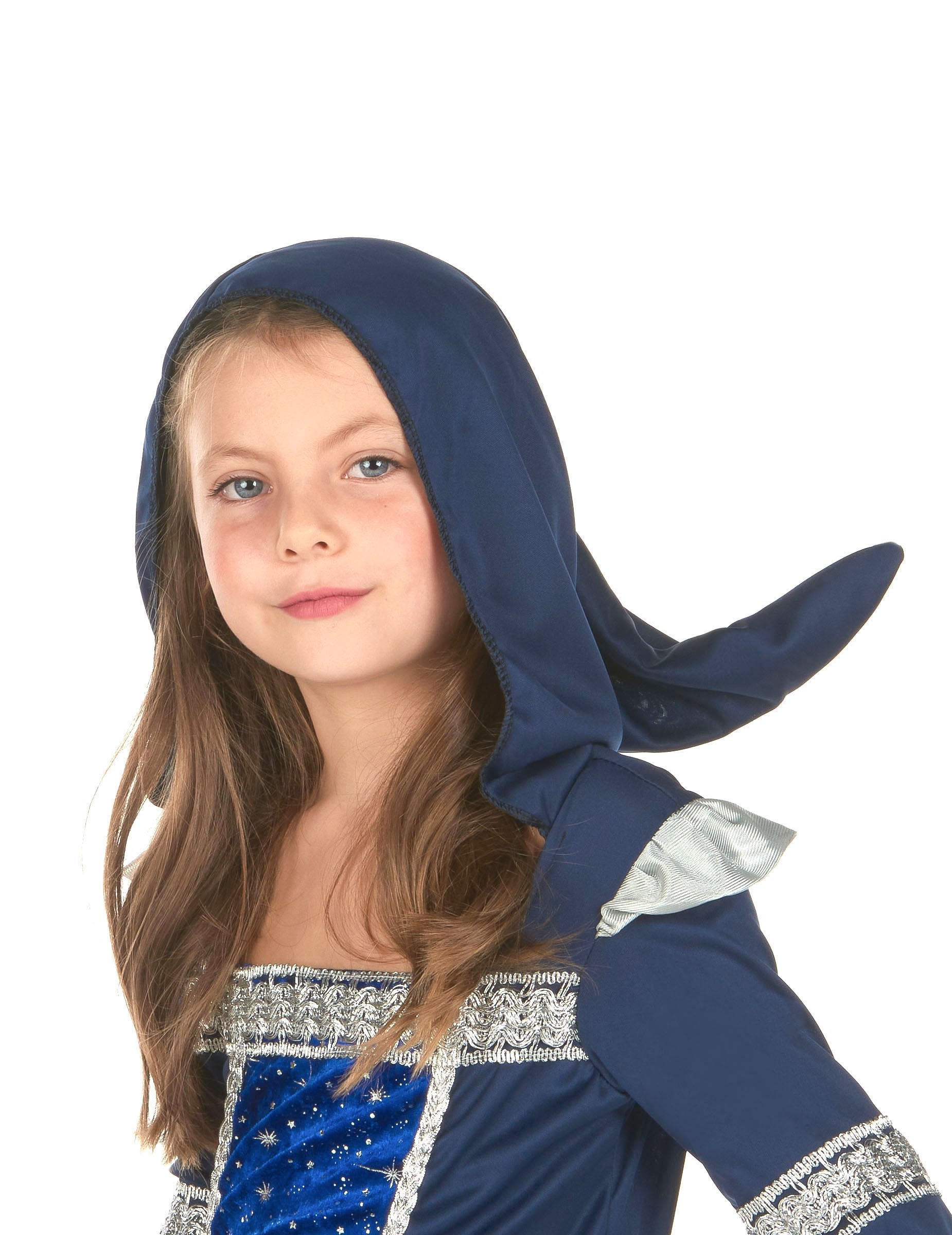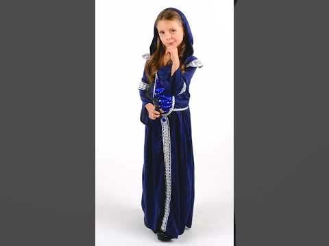Ovaj ponoćni plavi mađioničar namijenjen je djevojci i sastoji se od haljine. Haljina je kapuljača i plava. Vrh je dugačak i ima srebrne epaulette. Ukrašen je otiskom različitih zvijezda s prednje strane. Ovratnik i rukavi imaju srebrne uzorke. Dno haljine je ponoćno plavo i ukrašeno je srebrnim uzorcima na prednjoj strani. Veličanstveni lažni kamen ukrašava struk. Zabavite se bacajući čarolije na Noć vještica s ovom ponoćnom plavom mađionicom kostimom!