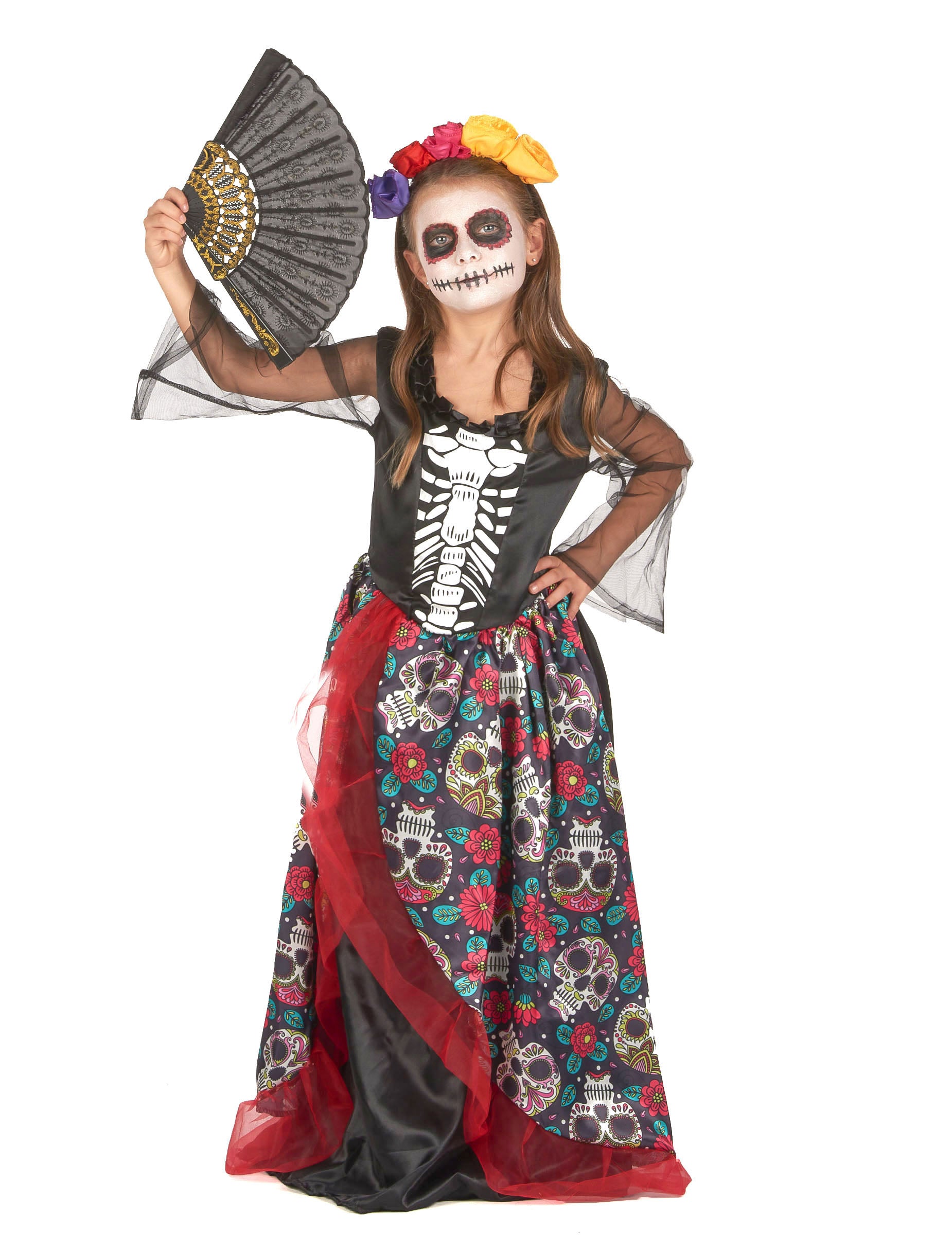 Ova prerušavanje Los Muertosa namijenjena je djevojci i sastoji se od haljine i kape. Vrh haljine je crn i na prednjoj strani ima skeletni otisak. Rukavi su dugi u prozirnom velu ispisanom iz ruke kostura. Dno haljine je dugo i crno. Prekriven je napadom ispisanim lubanjama i šarenim cvjetovima s prednje strane. Ukrašen je crvenim tilom. Kapica je crna traka za glavu ukrašena s nekoliko cvjetova različitih boja. Ova šarena prerušena dijagnoza bit će savršena za proslavu Noći vještica!