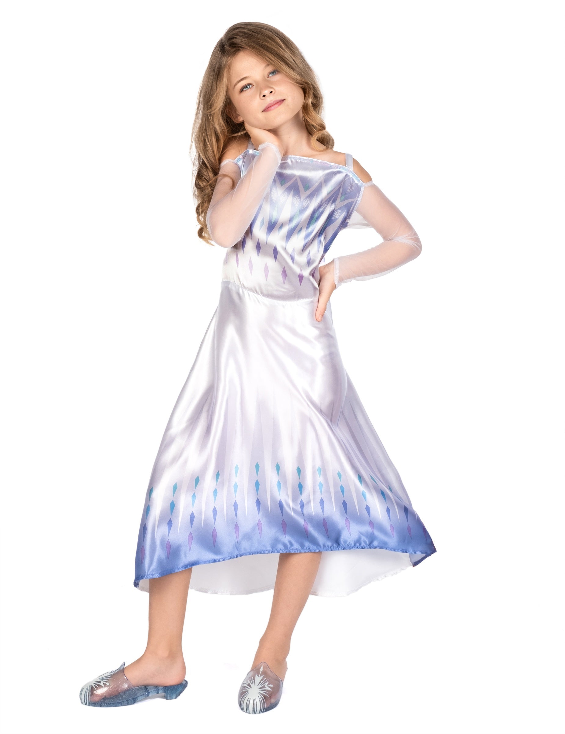 Ova kostim Elsa Queen of Neiges 2 pod službenom Disneyjevom licencom. Za djevojku se sastoji od haljine. Haljina je kostim poznate kraljice Arendelle. Bijela je boje s nijansama plave boje i ima dijamantni otisak na vrhu i dnu. Rukavi su dugi i na kraju plave boje. Vaša će kći ići na avanturu zajedno s Anna, Kristoffom i Olafom s ovom kostimom Elsa Queen Snow 2 za karneval!