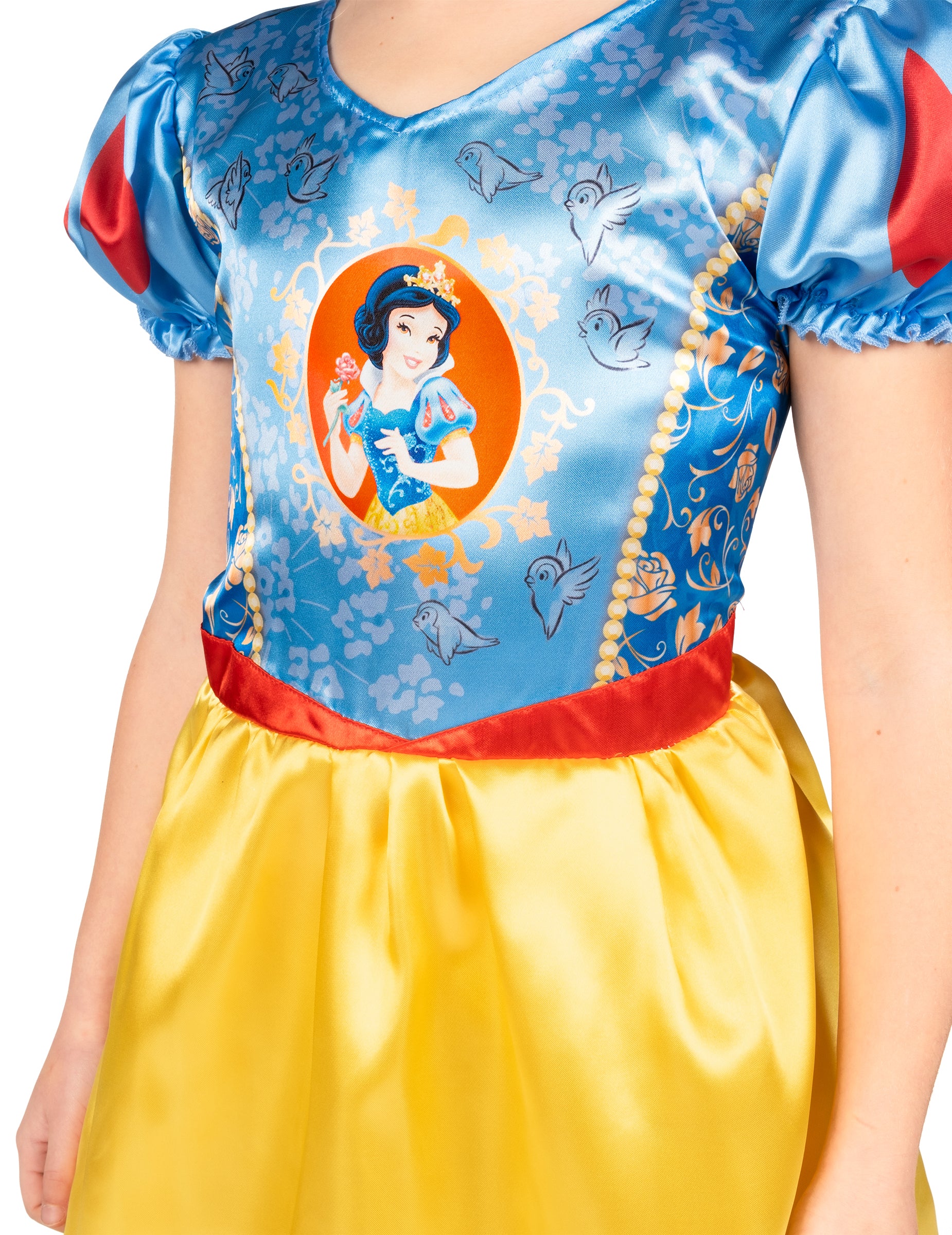 Službena prerušavanja Snow Disney -a ovog Disneya namijenjena je djevojkama. Ima haljinu koja se prodaje sama. Ova kratka haljina izrađena je od satenske tkanine. Dno haljine je satensko žuto. Vrh je plavi s ispisanim prilično žutim cvjetovima. Kratki rukavi su natečeni crvenim prugama. U središtu poprsja je tiskan portret snježno bijele princeze. Savršeni kostim Snjeguljica za karneval ili rođendan vaše kćeri na temu bajki.
