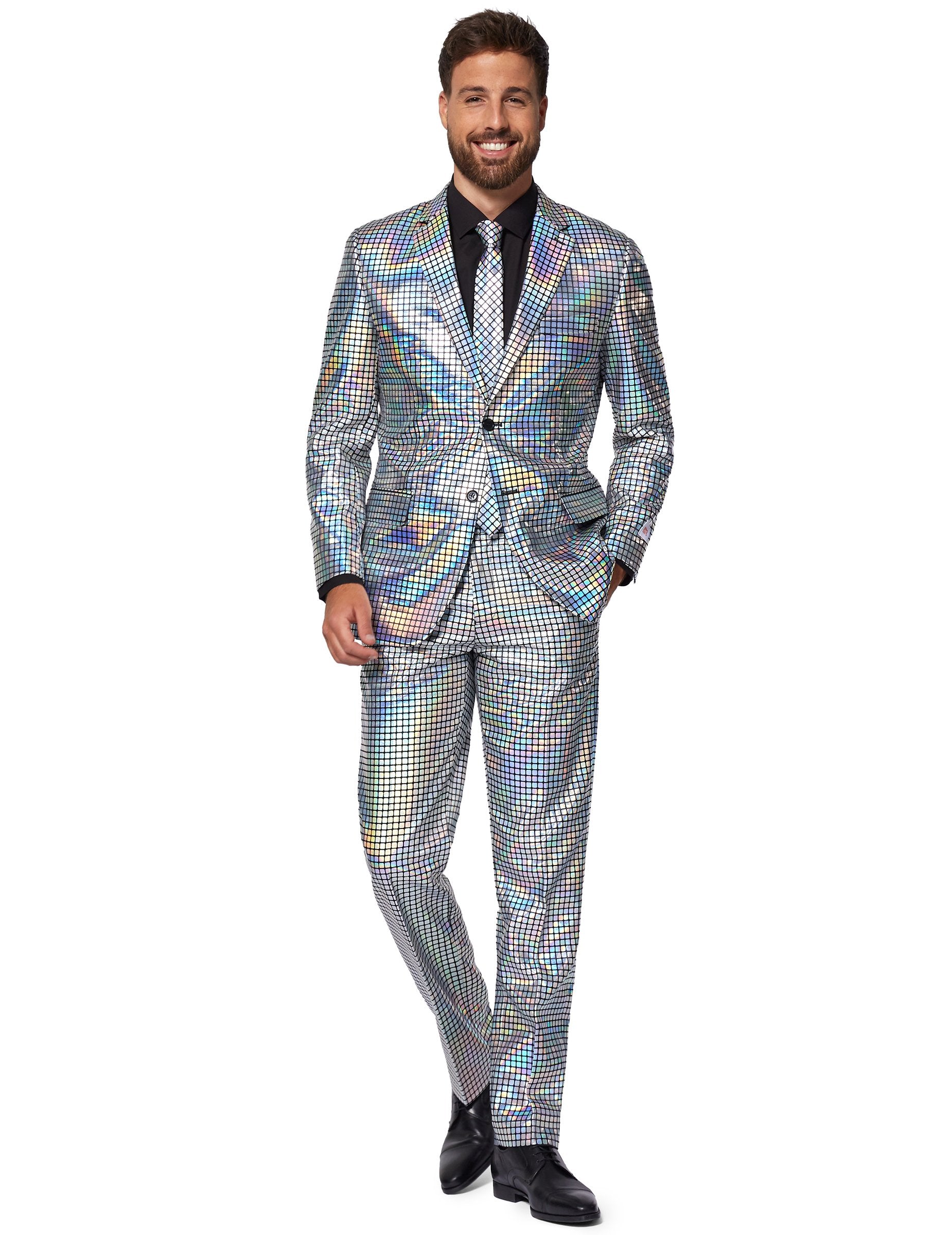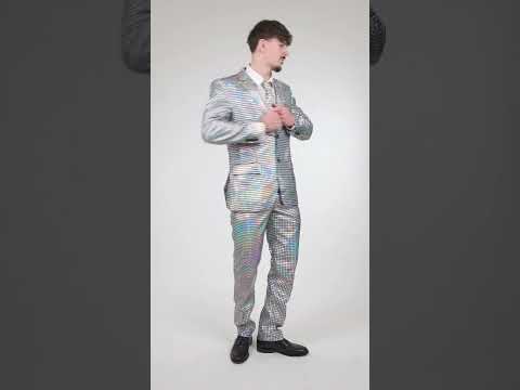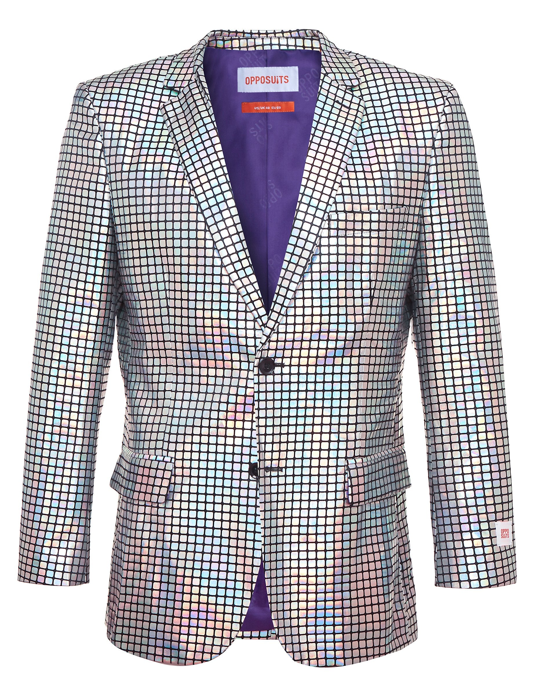 Ispod službena licenca Opposuits™Cijeli odjevni predmet je svijetao i prelijeva se, poput disko kugle. Jakna se kopča s dva crna gumba i ima ovratnik s reverom. Ima dva lažna bočna džepa i lažni džep na prsima.
