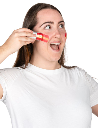 Ovaj štap za šminku navijača odgovara bojama Španjolske. To je u obliku trobojne (zelene, žute i crvene) štapića koja će vam omogućiti da lako i jednolično nanesete boje španjolske zastave. Ovaj dodatak bit će savršen za podršku vašem omiljenom timu tijekom sportskog natjecanja poput nogometnog svjetskog kupa! Sastojci: Ceteareth-2, Ceteareth-25, Copernicia Cerifera, Rinicus Communis (Castor), izopropil, palmitat, sorbitanski oleat, talc, fenoksietanol, imidazolidinil urea. Može sadržavati: titanij dioksid, oksid od crnog željeza, kiselo žuto 23/fd+c žuto 5 aluminijsko jezero, fd+plavo br.1 aluminijsko jezero, d+c, crveno 28