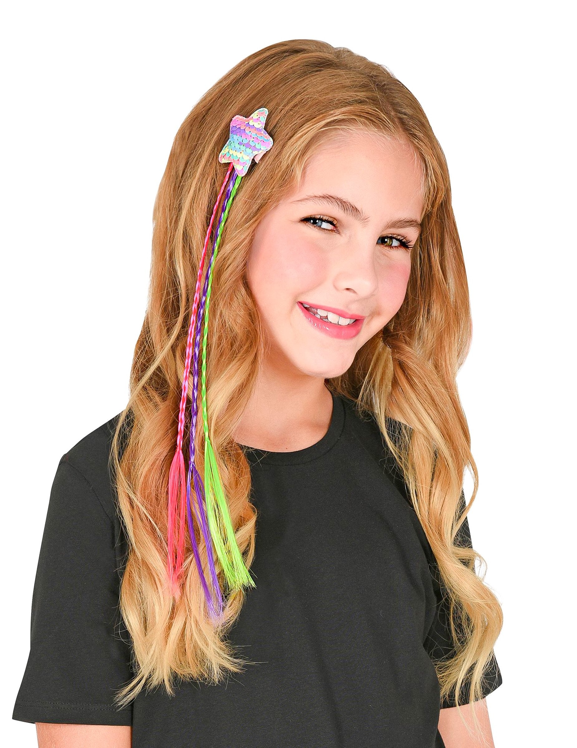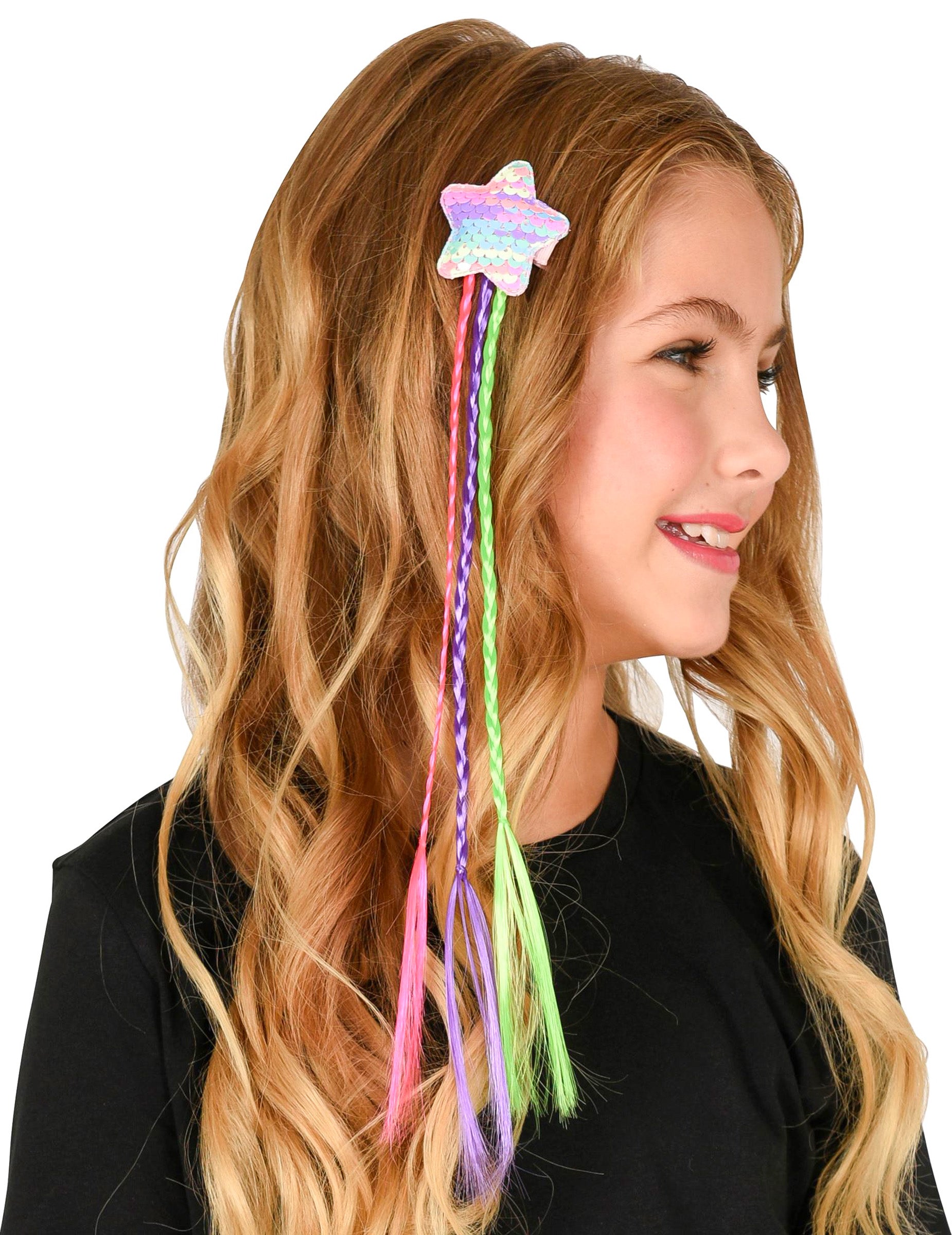 THE tri šarene pletenice Komponente dodatka pričvršćene su na metalnu kopču (prekrivenu trakom kako bi se izbjeglo oštećenje kose) na koju se svjetlucava zvijezda.