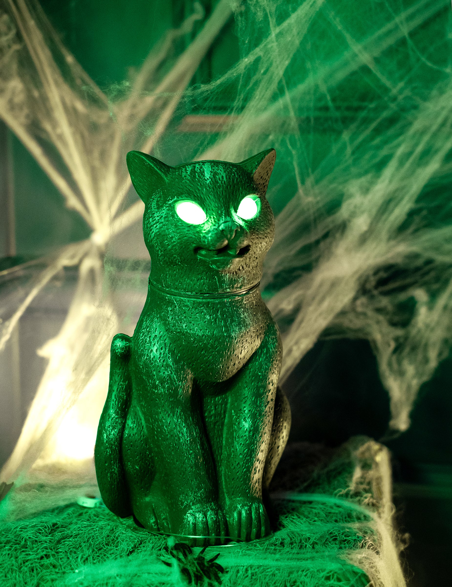 Ovaj zvuk i svijetla crna mačka mjeri oko 30 cm. Jednostavno ga morate uključiti tako da mu se glava okrene, a oči svijetle zeleno. Za još zastrašujuću stranu, ova mačka gura zavijanje. Ovaj ukras djeluje pomoću 3 AA baterije koje nisu uključene. Ova crna mačka bit će savršena za dovršavanje vašeg zastrašujućeg ukrašavanja povodom večeri za Noć vještica!
