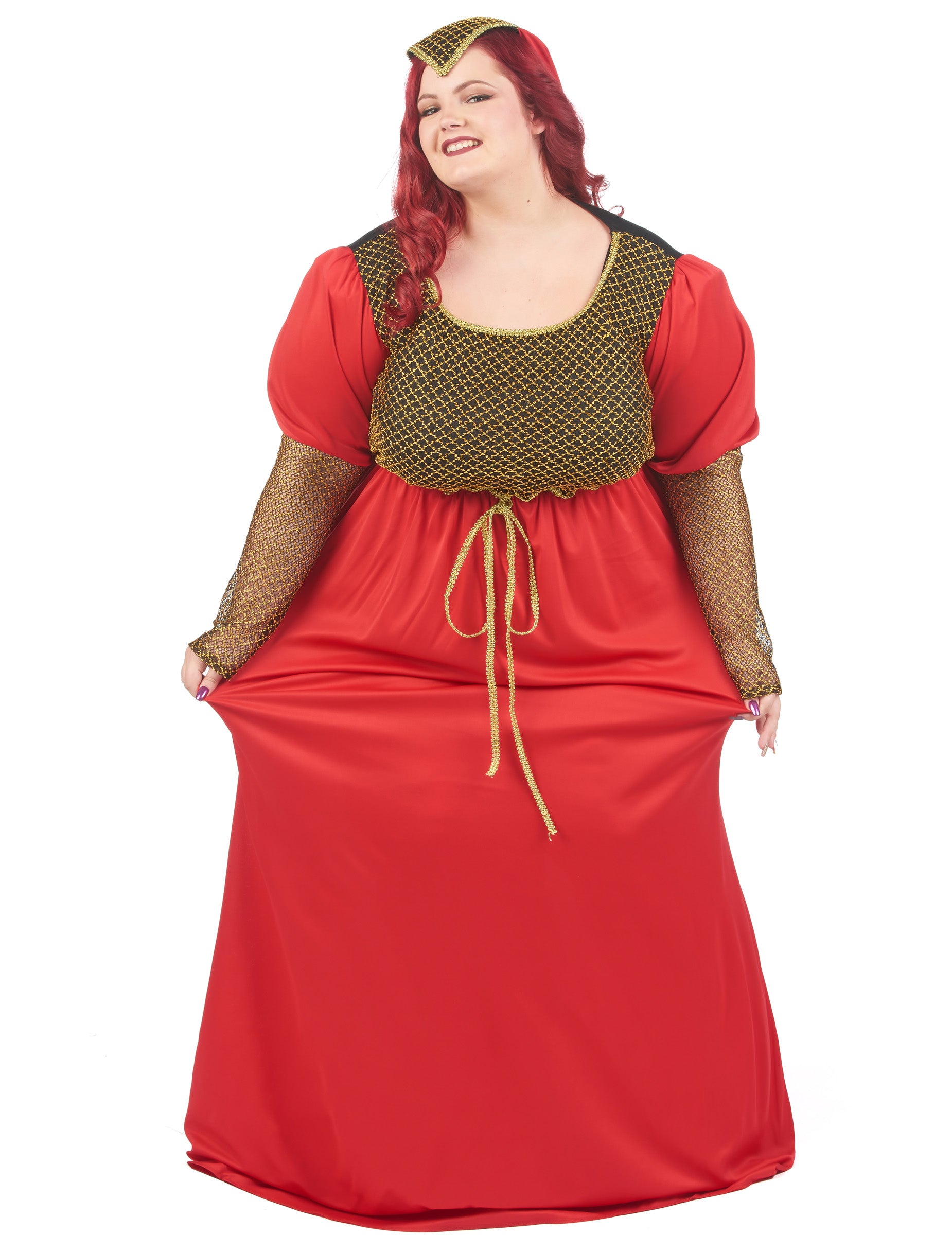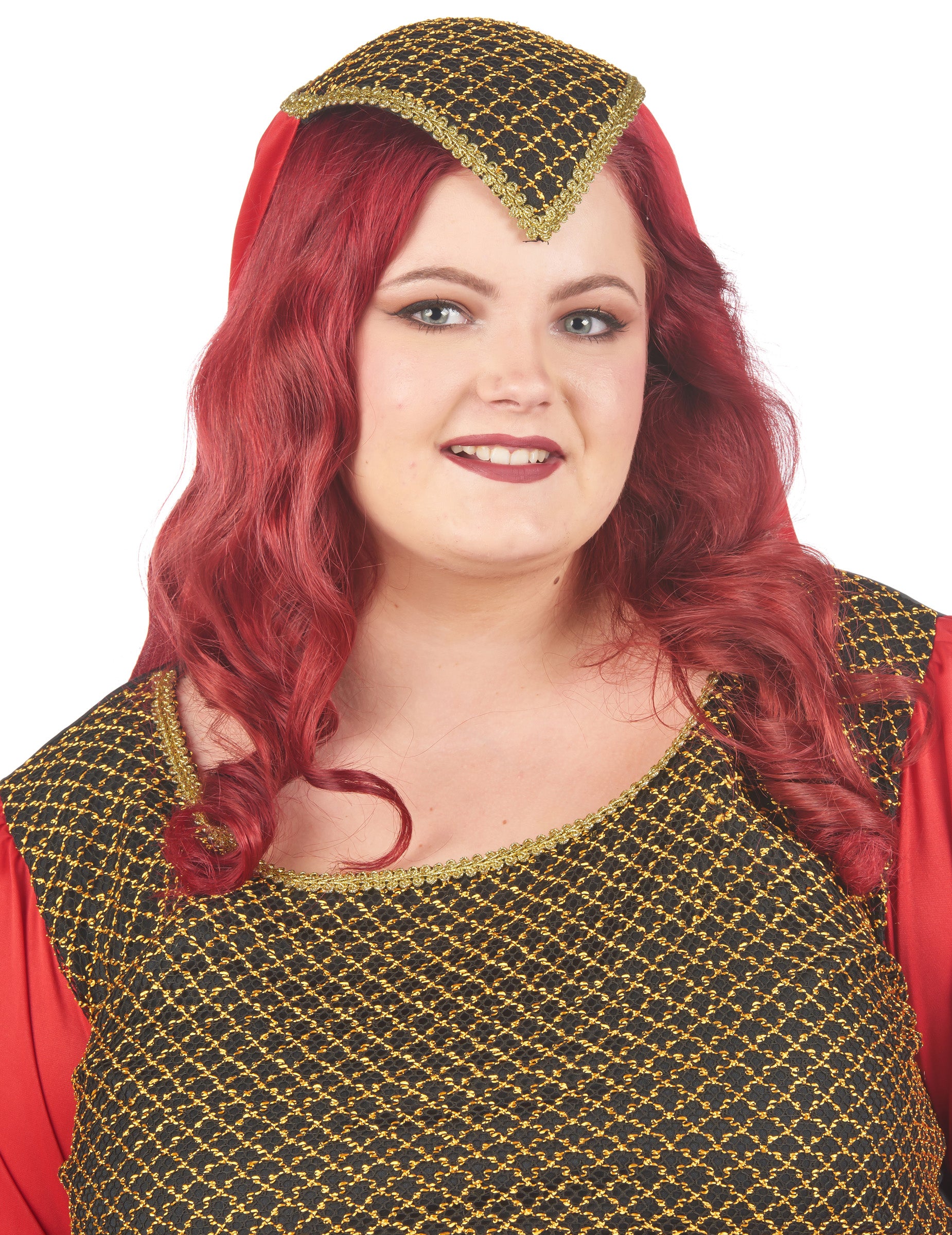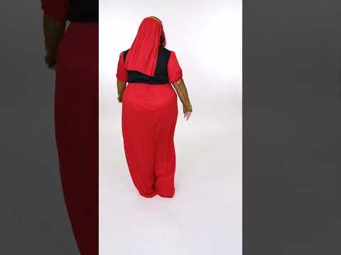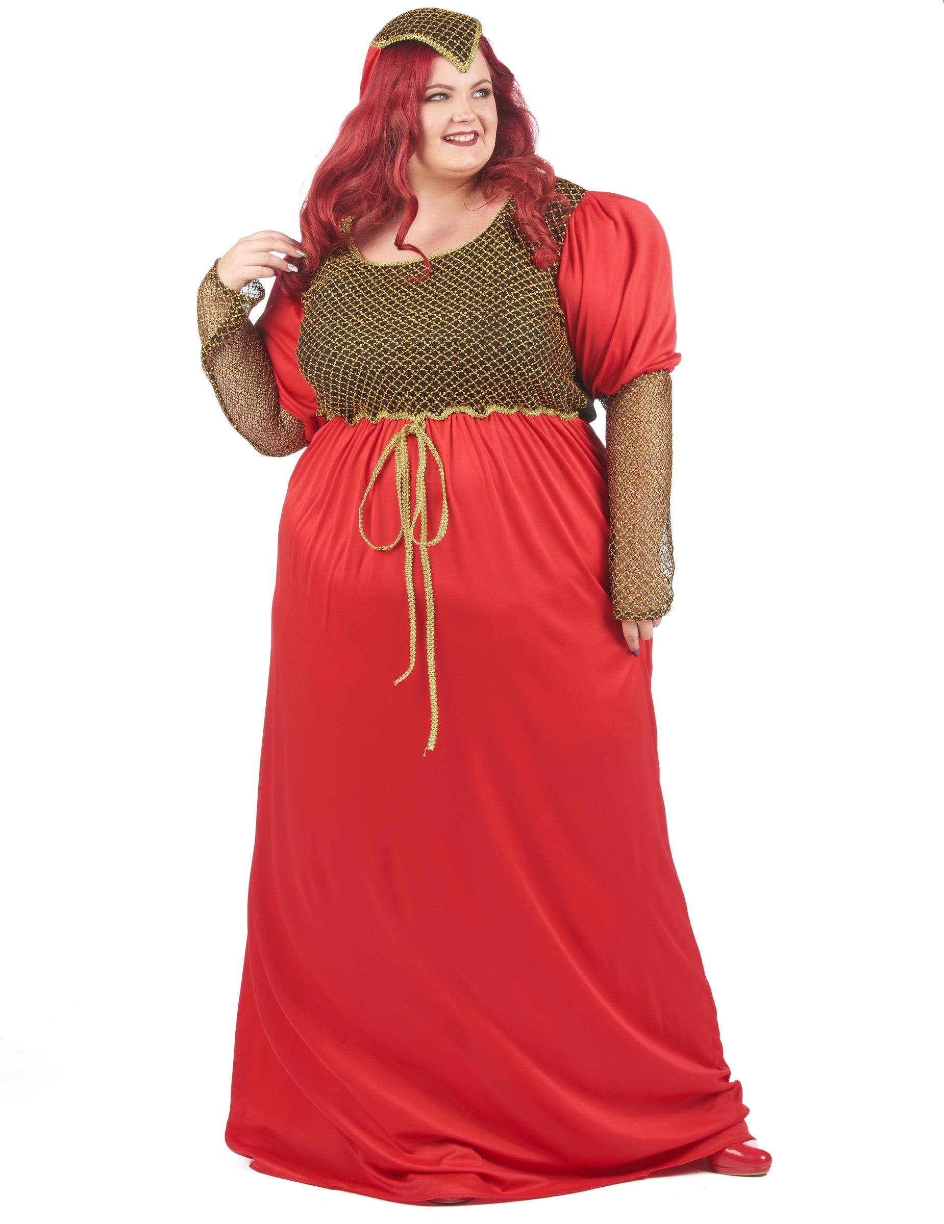 Ovaj crveni srednjovjekovni kostim crvene veličine namijenjen je ženama. Sastoji se od haljine i kape. Haljina prerušavanja vrlo je dugačka s glavnom bojom za crvenu. Karakterizira ga veličanstveni vez u zlatnim i crnim bojama u rukavima, ali i na poprsju na prednjem dijelu haljine. Haljina je elastična u pogledu veličine, što će olakšati održavanje i udobnost. Rukavi su natečeni i crveni, opremljeni epaulettes. Što se tiče pokrivača, ona je izravno pričvršćena na crni češalj. Naći ćete mali crveni veo koji će se spustiti na ramena. Ova prerušavanje u srednjovjekovnu princezu bit će idealna za usavršavanje vaše večeri na temu karnevala, za novu godinu ili za bilo koji drugi prerušeni događaj!