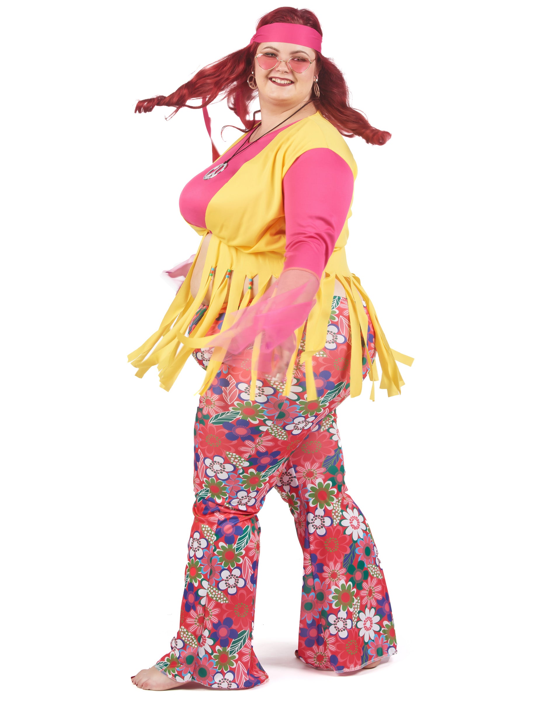 Ovaj kostim velike veličine namijenjen je ženama. Sastoji se od vrha s prslukom, hlačama i trakom za glavu. Vrh prerušavanja je kratka, ružičasta boja. Ukrašeni su plamenim rukavima u mreži. Naći ćete i žuti prsluk koji će kliznuti preko vrha, praćen dugim rubovima. Prsluk je izravno ušiven s gornjom ružičastom. Elastične hlače kostima ukrašene su mnoštvom uzoraka u obliku cvijeća. Svojim elastičnim materijalom bit će lako i ugodno nositi. Konačno, bend u stilu bandana usavršit će cjelinu, ružičasta je boja za mjerenje 150 x 5 cm. Ovaj hipi kostim bit će idealan za projiciranje vas u 60 -ima i 70 -ima 'povodom karnevala ili za novu godinu!