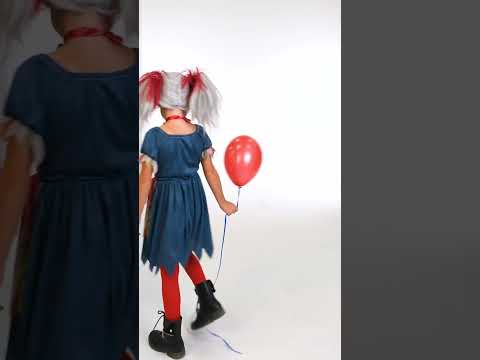Ovaj šareni kostim klauna namijenjen je djevojci. Sastoji se od haljine i kravate. Haljina je s bijelim prugama, bež i crvenom bojom s sjajnim efektom krvi. Dno i glave ramena su nebesko plave boje. Dno haljine i rukava izrezani su u obliku zuba. 2 crvene pompome su na torzu. Luk je crvena i sjajna. Ovaj kostim klauna bit će idealan za to da budete najstrašniji tijekom vaše sljedeće večeri Noći vještica!