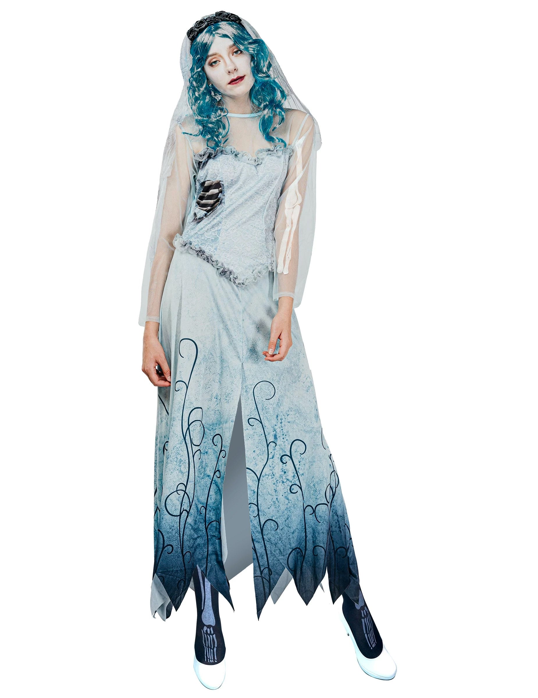 Ovaj pogrebni kostim za vjenčanje namijenjen je ženama. Uključuje dugu haljinu i mladenku s dugim jedrom. Haljina je svijetloplava na vrhu haljine i na dnu postaje tamnoplava. Dio poprsja i dugih rukava su u svijetloplavom velu. Na ruci se crta bijela kosturska kost. Vrh haljine ima oblik čipkastog bustiera. Na ovom bustieru je crno -bijela rupa. Dno haljine uključuje otvor na prednjoj strani i uzorke tamnoplavih stabljika koje se idu uz noge. Oglas je svijetloplava boja koja podsjeća na dugu haljinu i stoji s crnom trakom za glavu ruže. Ovaj pogrebni kostim vjenčanja idealan je za originalni i hladan kostim za sljedeću večer Noći vještica! Savjet: Odlučite se za blijedu šminku za sve više efekt smrzavanja!