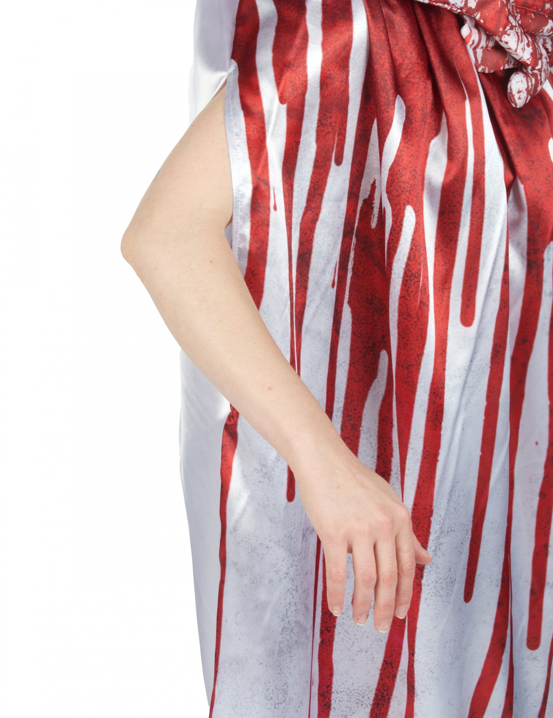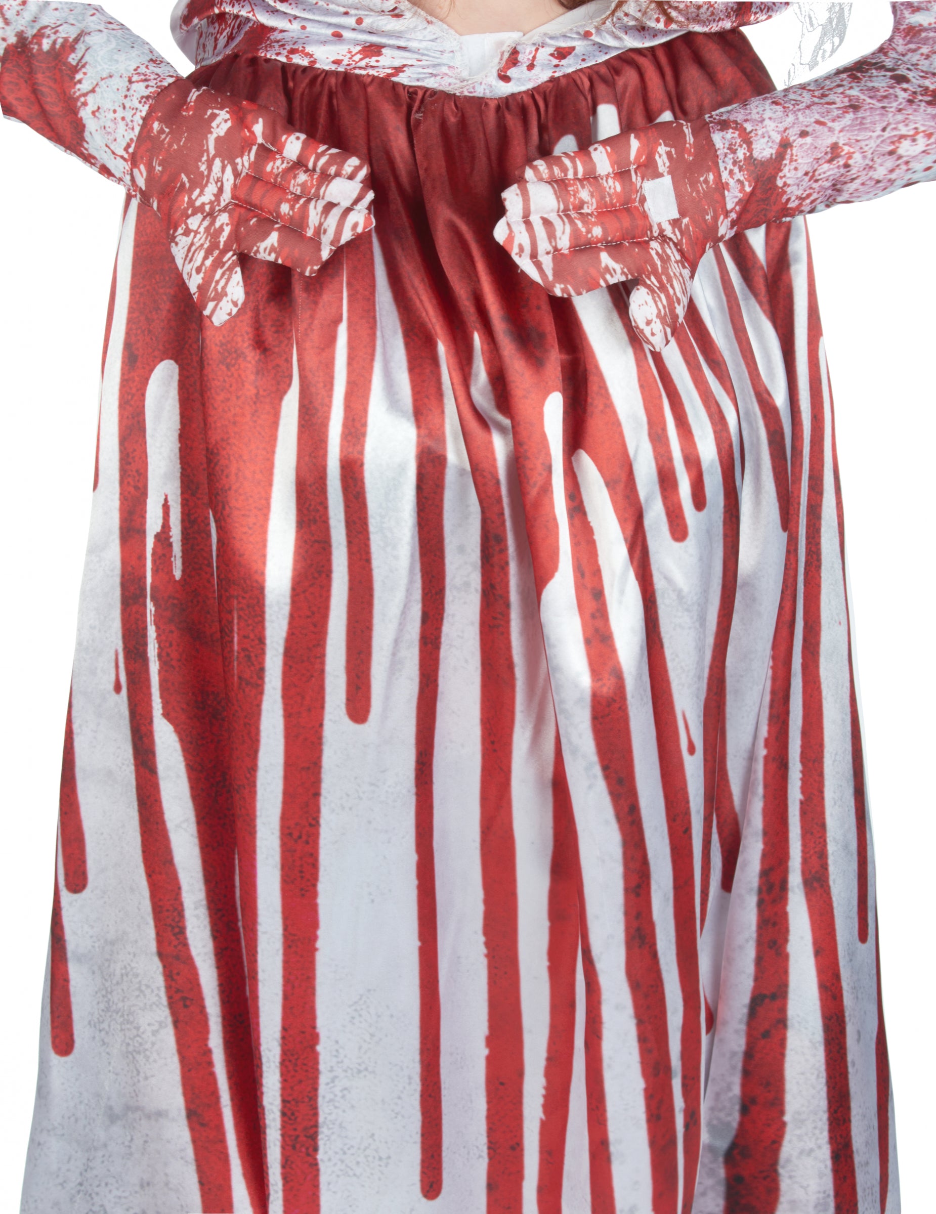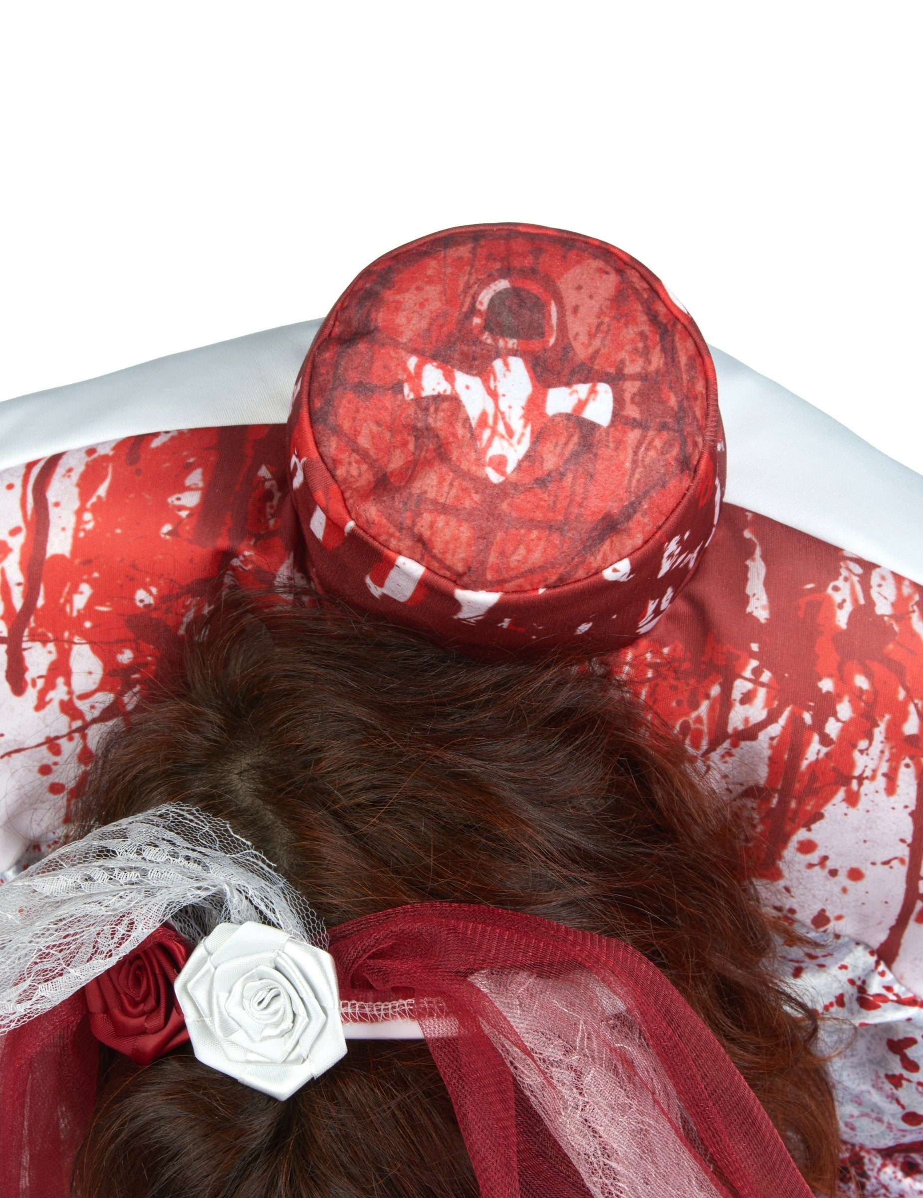Ovaj mladenkini kostim bez glave namijenjen je ženama. Uključuje haljinu i kapu. Vjenčanica je podstavljena na vrhu i s otvorom za glavu u poprsju. Otvori za ruke također su prisutni na stranama suknje. Podstavljeni vrh predstavlja vrat bez glave za pravi efekt glave. Ruke će vam okružiti glavu kako bi dali zadatak. Haljina je prekrivena lažnim mrljama krvi koje teče kroz prerušavanje kako bi se stvorio još zastrašujući učinak. Kapica je u čipki i ukrašena crvenim i bijelim ružama. Još niste odlučili svoj kostim za Noć vještica? Ovaj mladenkini kostim bez glave učinit će trik! Bit će savršeno za teroriziranje vaših prijatelja ili draga tijekom večeri Noći vještica!