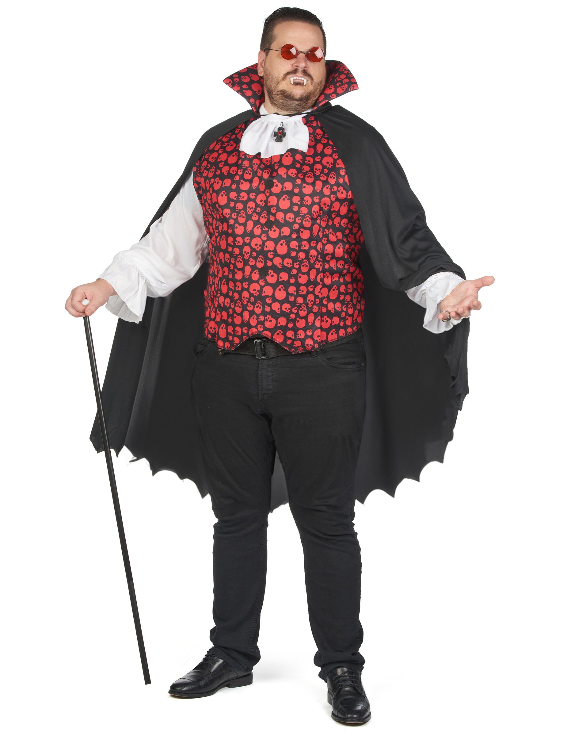 Ovaj veliki vampirski kostim namijenjen je za muškarce. Sastoji se od ogrtača i košulje za usjeve (hlače i cipele nisu uključene). Košulja je crna s crvenim nebom u prsima. Ima duge bijele rukave i bijeli usjev zašiljen na dekolteu. Sadrži i ogrebotinu u gornjem dijelu leđa kako bi je jednostavnije stavio. Cape je crn i opremljen je crnim ovratnikom s crvenim lubanjama. Vezana je žicom oko vrata. Izrezana je na dnu na dnu. Dovršite ovaj vampirski kostim s crnim hlačama i spremni ste za sljedeću večer za Noć vještica!