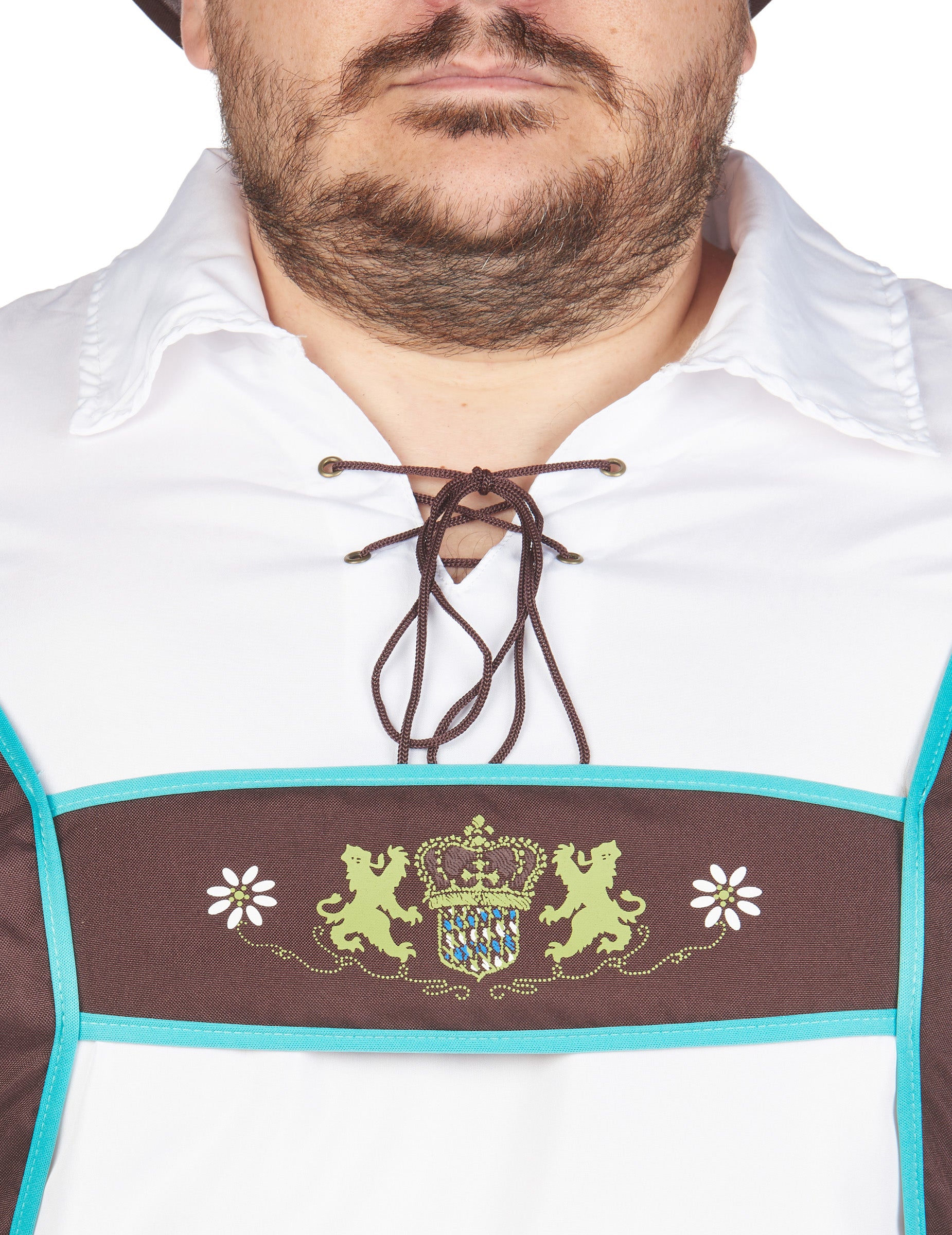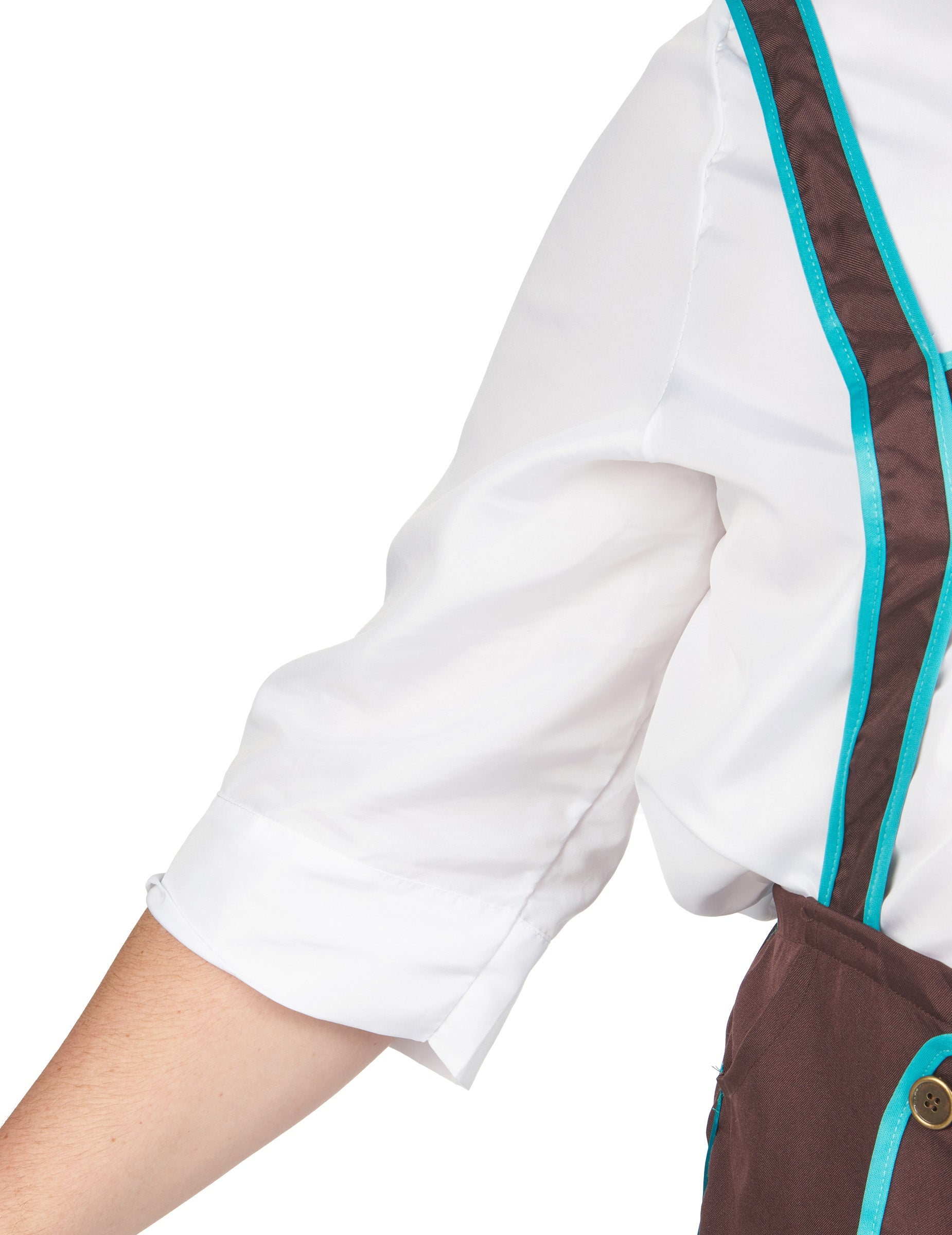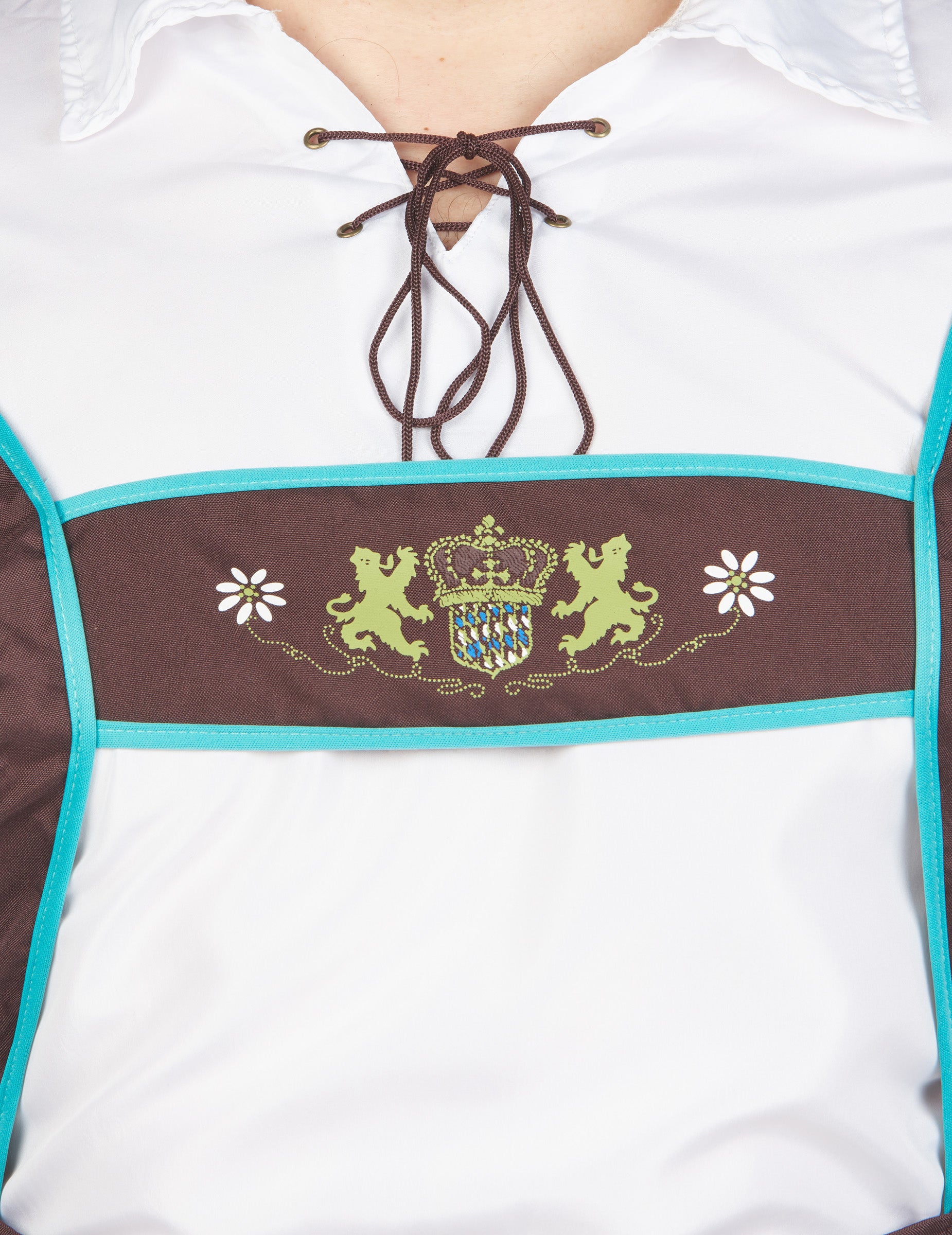 Ova bavarska bavarska cjelokupna prerušavanja namijenjena je odraslima. Uključuje kombinezone, vrh i šešir. Kombinezoni su smeđe boje i nosi zelenu granicu. Kratkom duljinom stići će iznad koljena i ukrašen uzorcima na gornjem dijelu. Bijela košulja dostupna je za cjelinu. Napokon, smeđi šešir dovršit će vašu bavarsku odjeću! Ova prerušavanje bit će savršena za vašu večer na temu festivala piva!