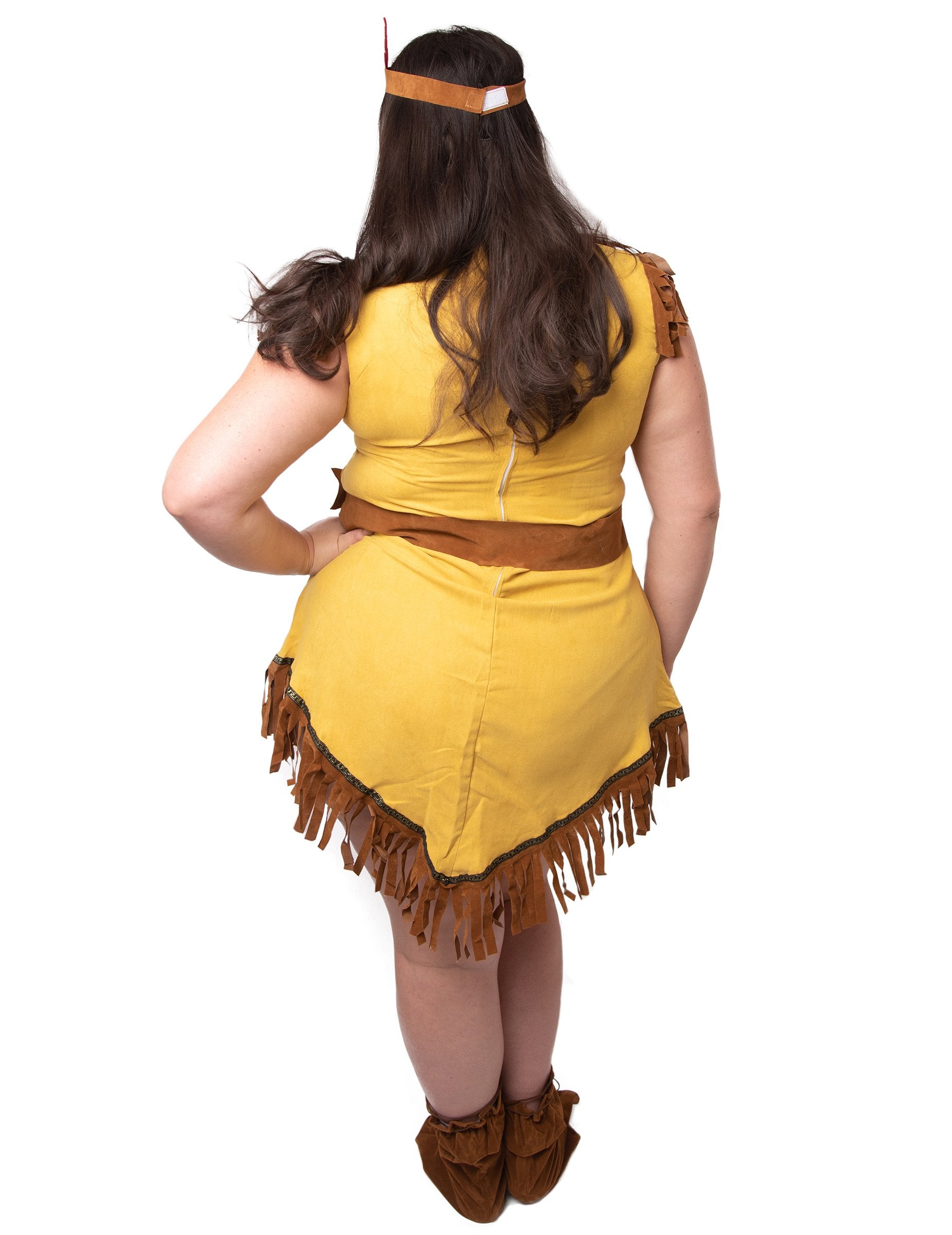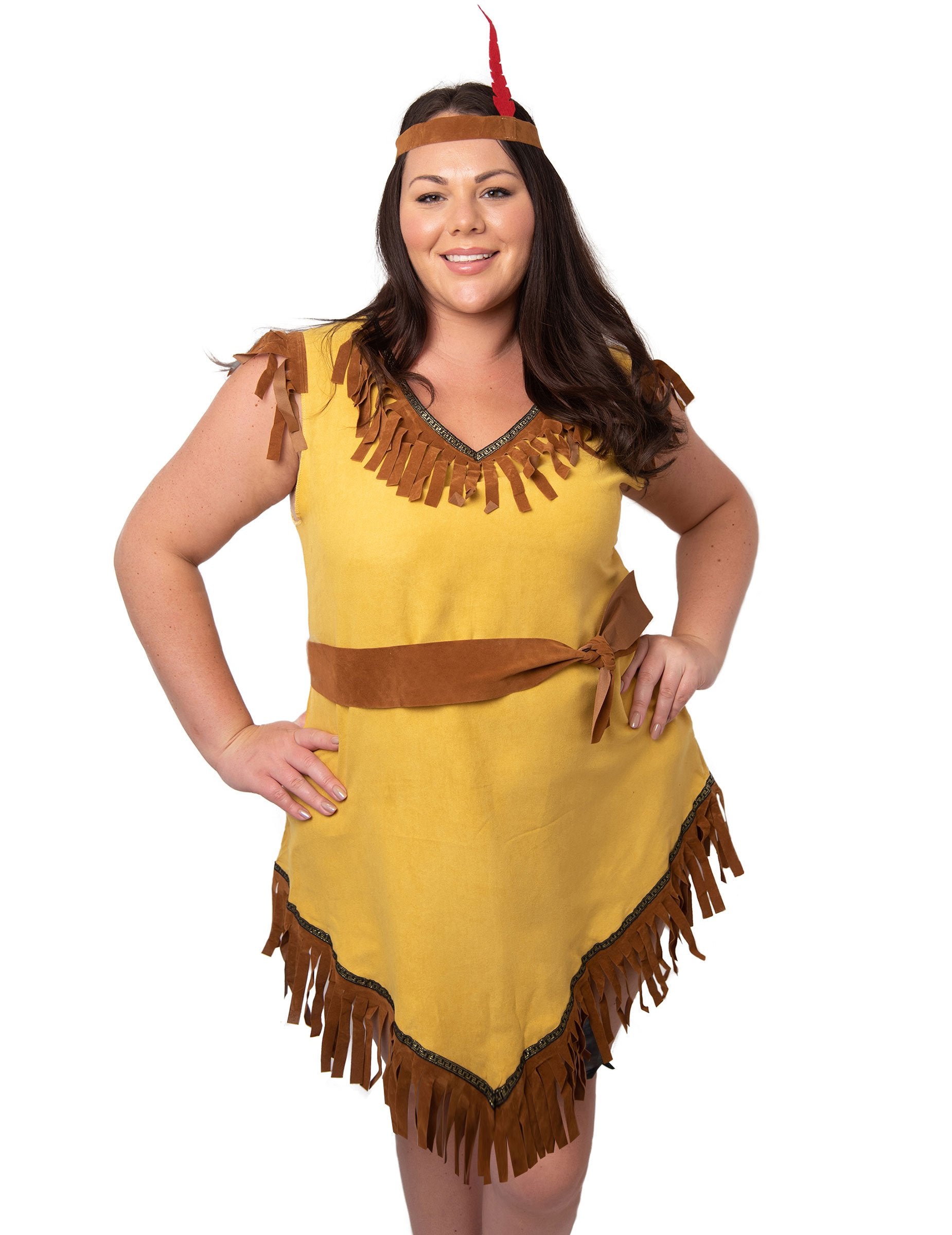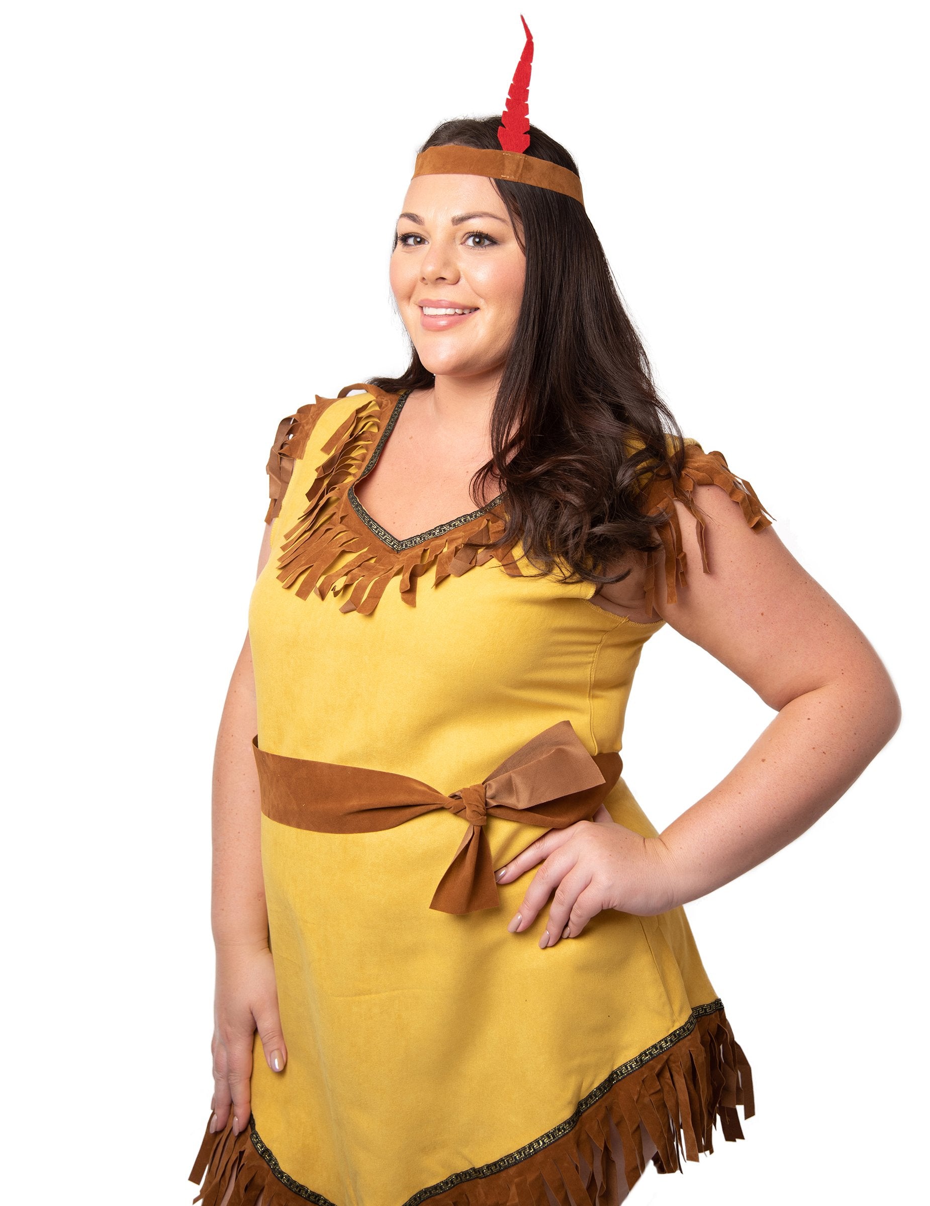 Ova velika, velika asimetrična indijska prerušavanje namijenjena je ženama. Sastoji se od haljine, pojasa i trake za glavu. Haljina za kostime je bež/svijetlo smeđe boje s ugodnim antilop dodirom. Karakterizira ga asimetrični rez na razini prednjeg donjeg dijela. Uključuje smeđe rubove na dnu, na ramenima i dekolteu. Smeđi pojas savršeno će se uklopiti u kostim u vašu siluetu. Konačno, dostupna je traka za glavu, također smeđa boja, popraćena perom. Ova prerušavanje bit će savršena za vašu večer na temu Indijanaca kao za karneval ili za novu godinu!