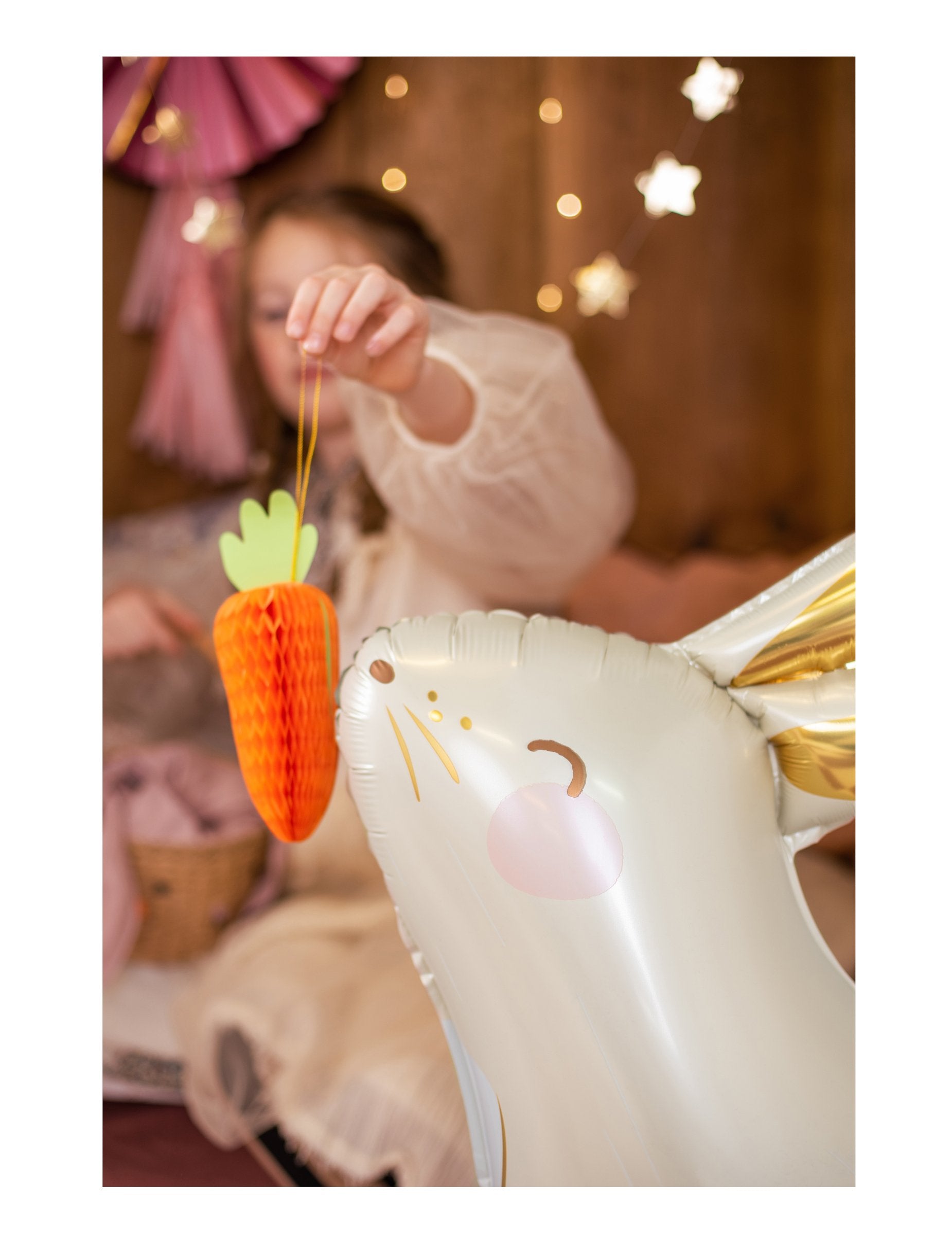 Dodajte dašak šarma svom interijeru s ovim suspenzija od 20 cm U visinu. Predstavljajući mrkvu u nijansama narančaste i zelene, ovaj ukrasni element izrađen je od papira u obliku saća za jedinstveni reljefni efekt. Viseći ukras u obliku mrkve od papira u obliku saća idealan je dodatak za stvaranje šareni ukrasi za Uskrs uspješan.